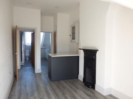 Ceiling light point, wall mounted thermostat for the electric heaters, oak veneer doors leading through to the bedroom, bathroom and living space. Throughout this area there is wood effect flooring which flows through into
