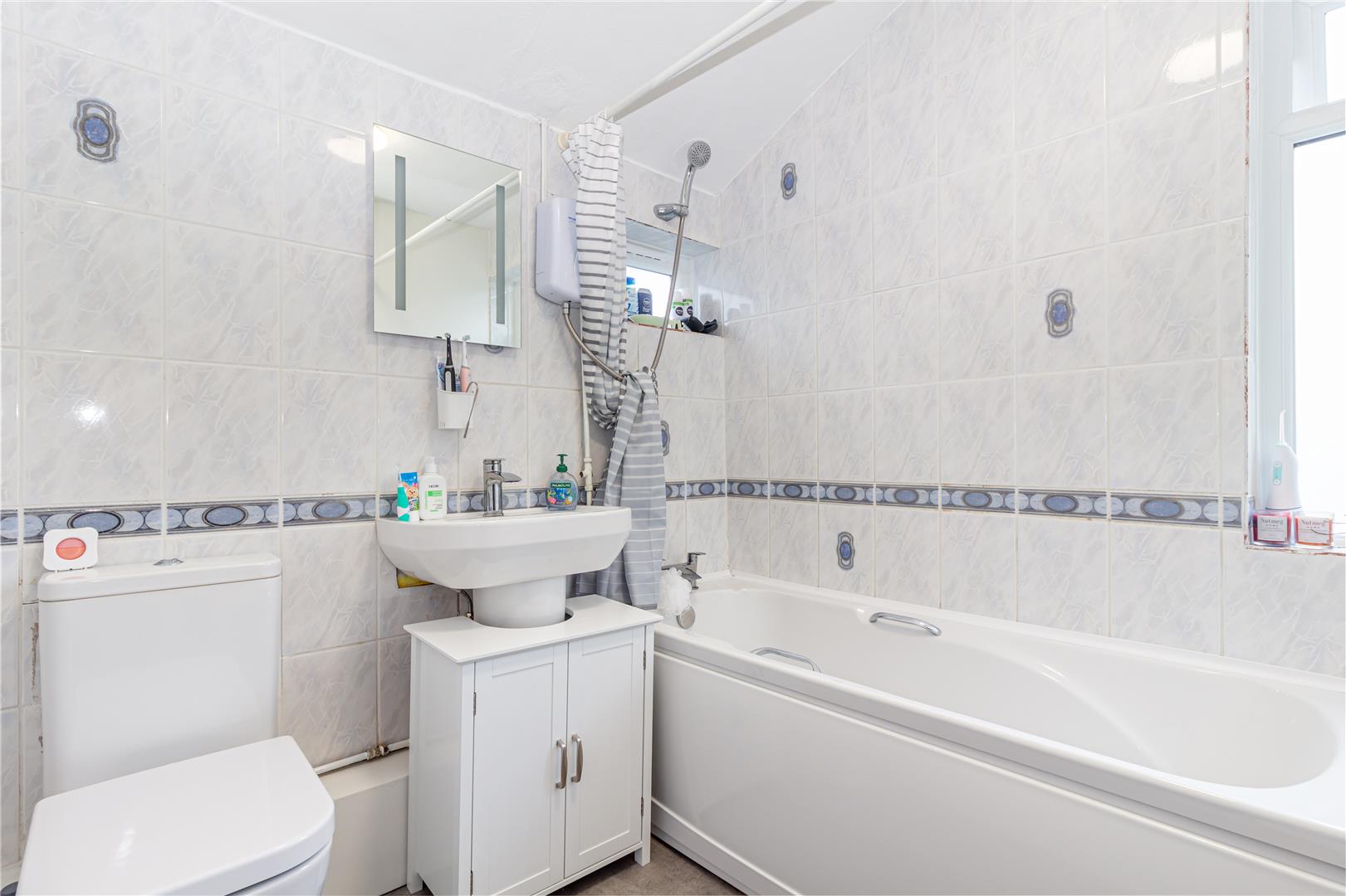 Ceiling light point. Radiator. Panelled bath with Triton electric shower over. Obscure double glazed window to front and side aspect. Pedestal wash hand basin. Low level WC.
