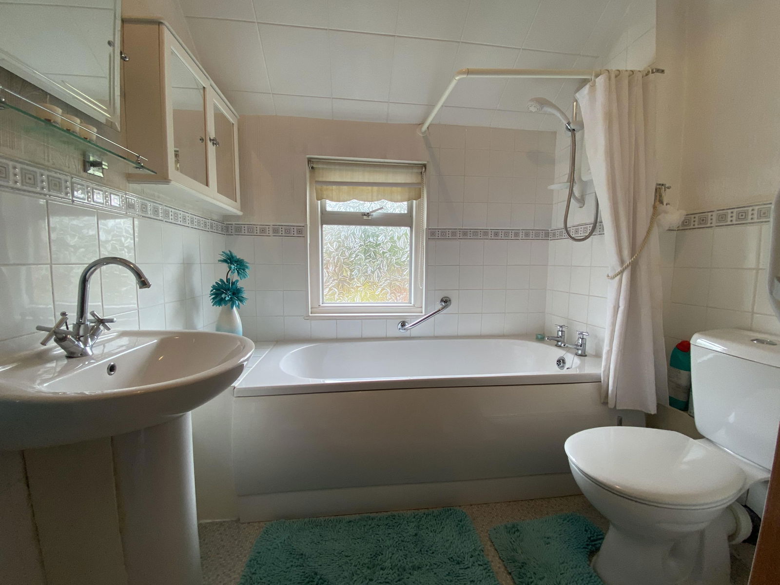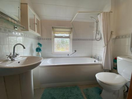 Vinyl flooring, obscured glazed window to the rear, close coupled WC, pedestal wash hand basin, partially tiled walls, panelled bath with electric Triton shower, chrome heated towel rail, ceiling light fitting and wall light. Boiler cupboard with Worcester Bosch boiler.