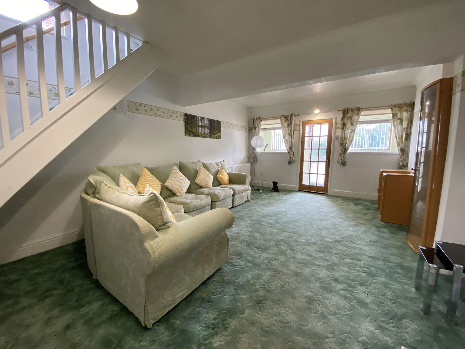The property is set back from the road behind a grass verge and paved foregarden. steps lead up to the glazed door opening to the