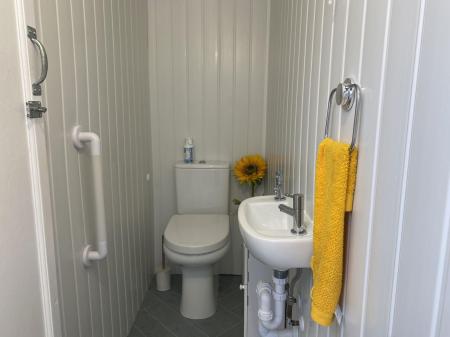 Vinyl flooring, close coupled WC, electric heater, wall mounted sink, panelled walls and wall light.