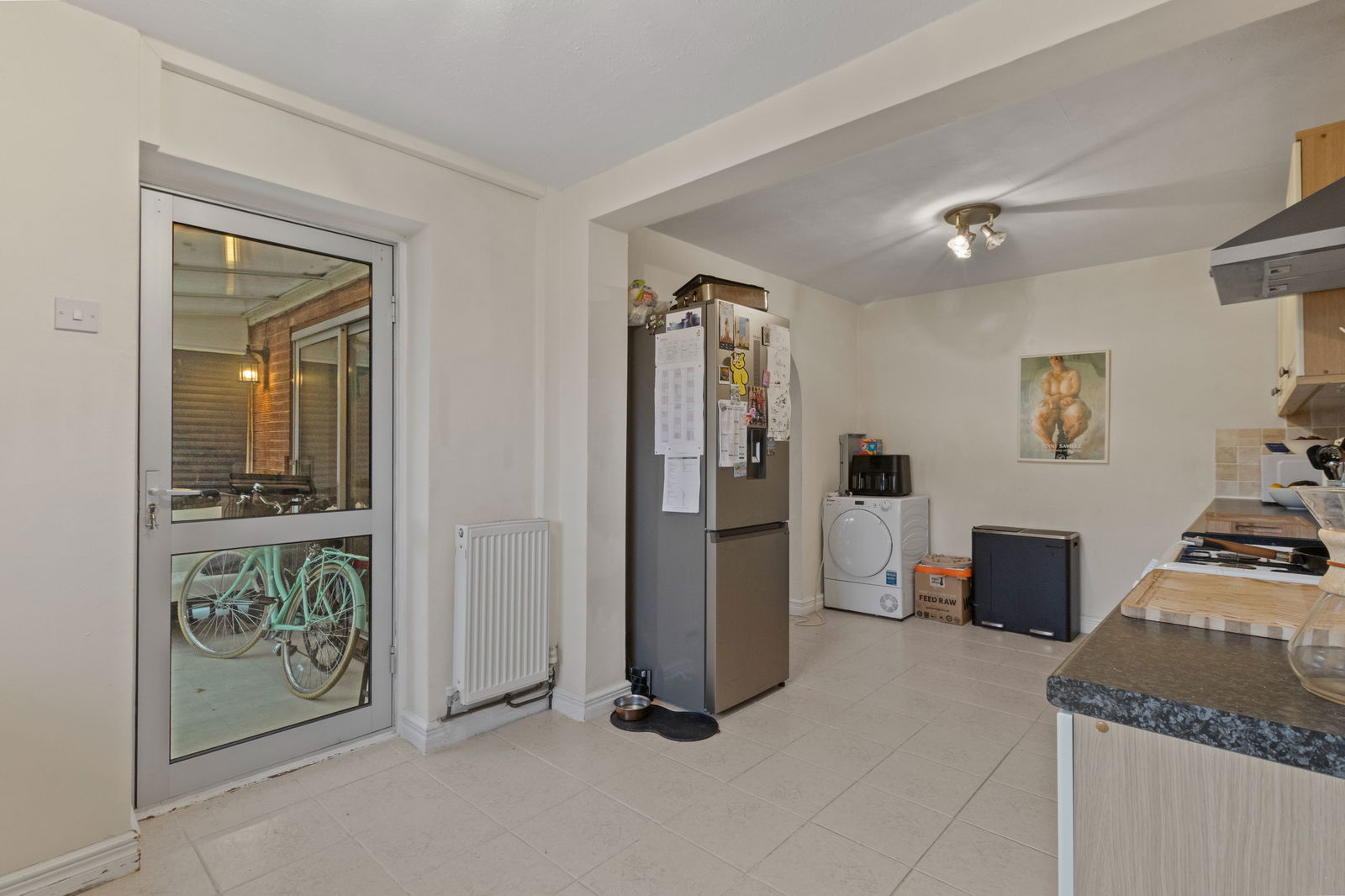 Range of base and eye level units with space for washing machine and dishwasher with worktop over and a one and a half stainless steel sink and drainer, tiled floor, partially tiled walls, radiator, space for cooker and extractor fan over. Two ceiling light fittings and extractor fan. An archway open to the dining area with door to the conservatory.