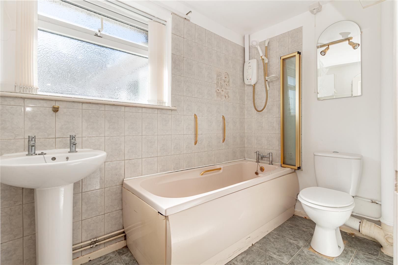 Bath with electric Mira shower over. Pedestal wash hand basin. Low level WC. Radiator. Ceiling light point. Obscure double glazed window to side aspect.