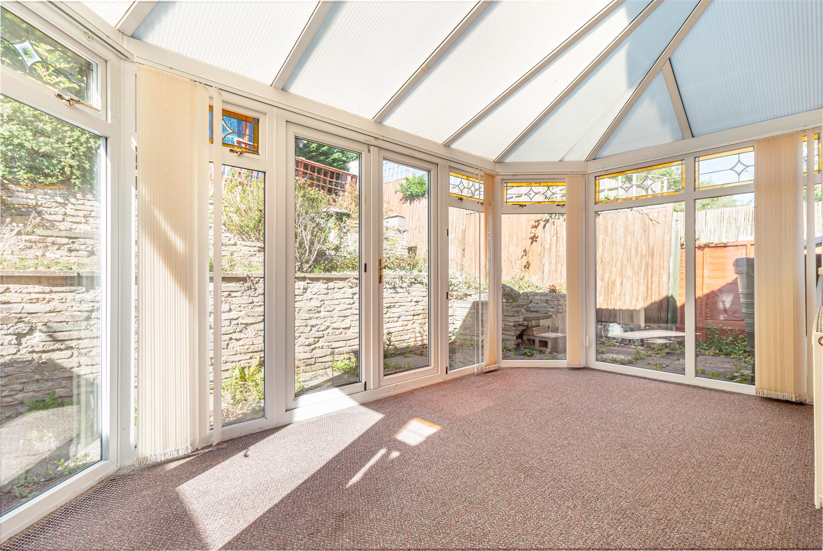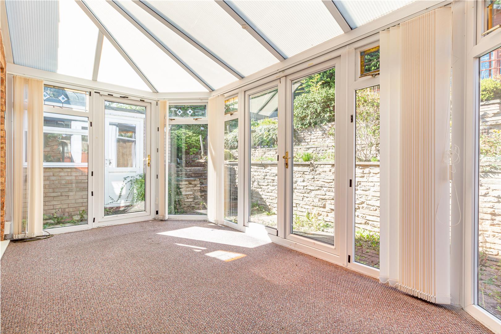 Double glazed windows all round with stained glass detailing on upper windows. Radiator. Wall light point. Built in blinds. Double glazed patio doors and Double glazed single door leading off to: