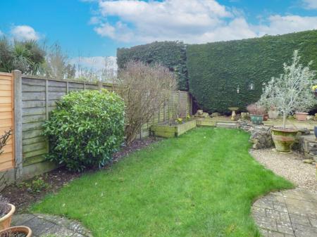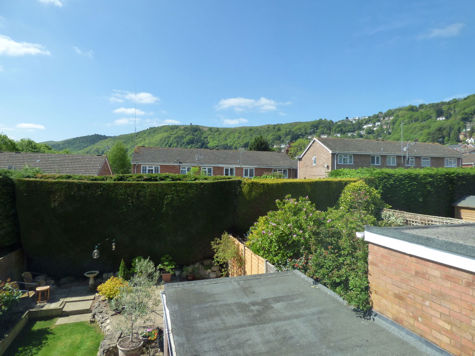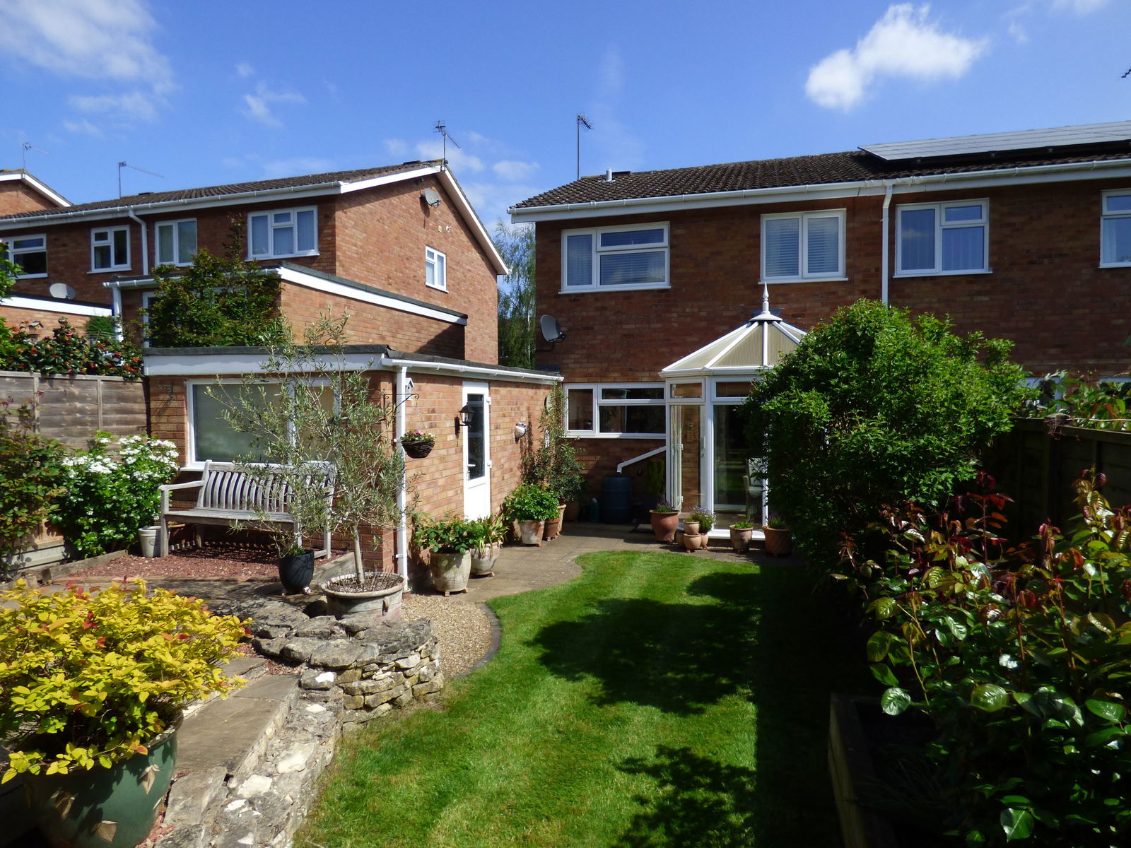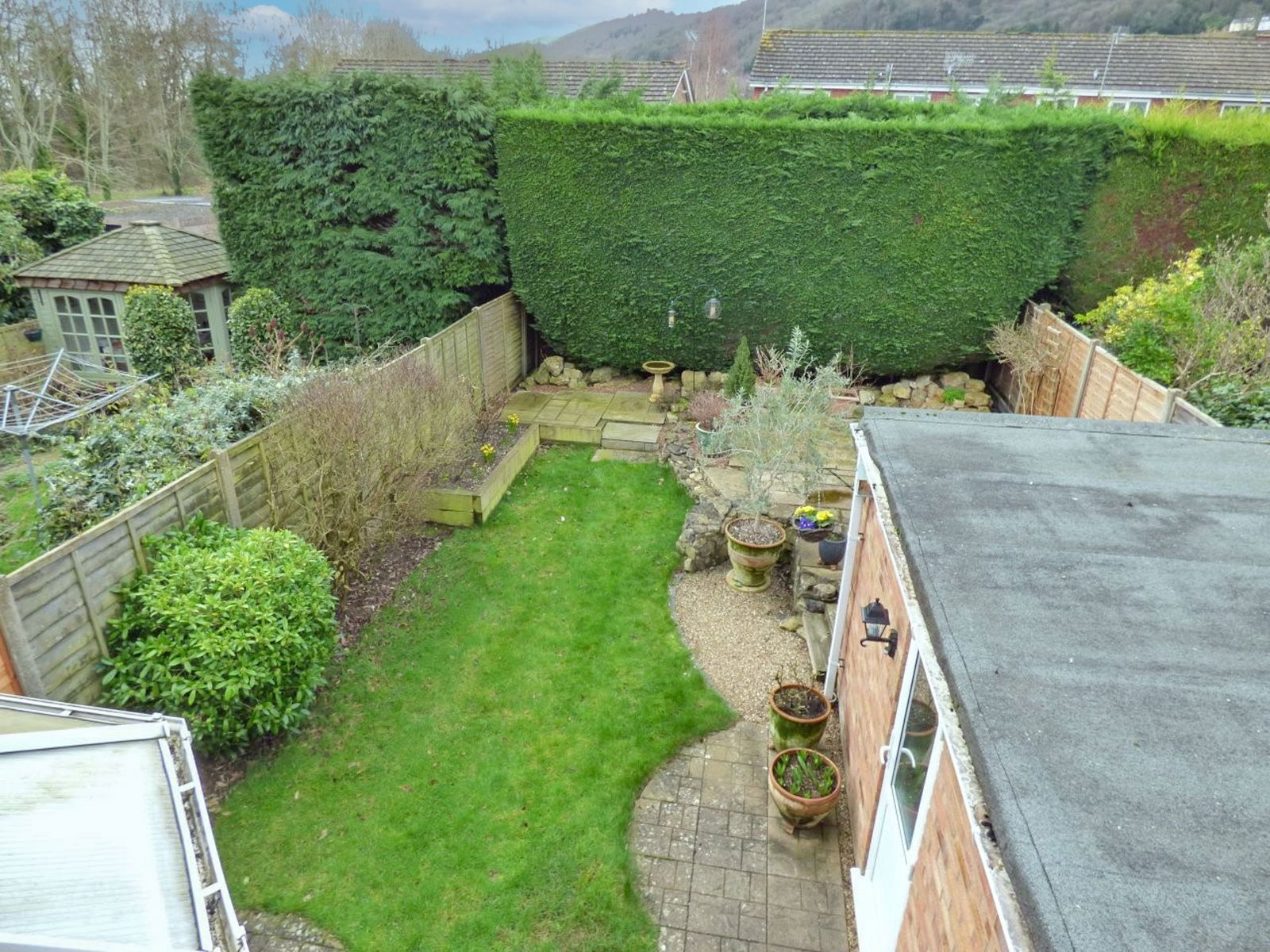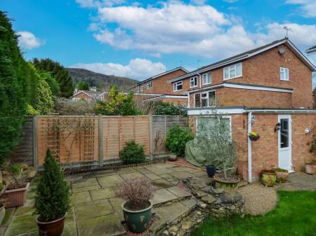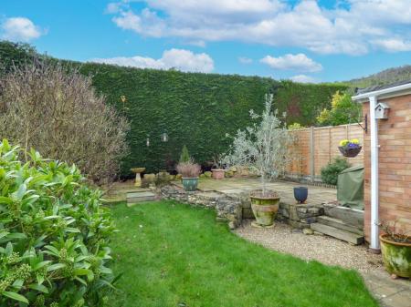 This stunning south facing garden has been loving cared for by the current owners. As you come out of the conservatory there is a small paved patio with water butt and leads around the small lawned area with mature borders with a mix of beautiful plants and flowers. Steps lead up to what was previously a large pond, but has been cleverly made into a large stone seating area with views up to the Malvern Hills.