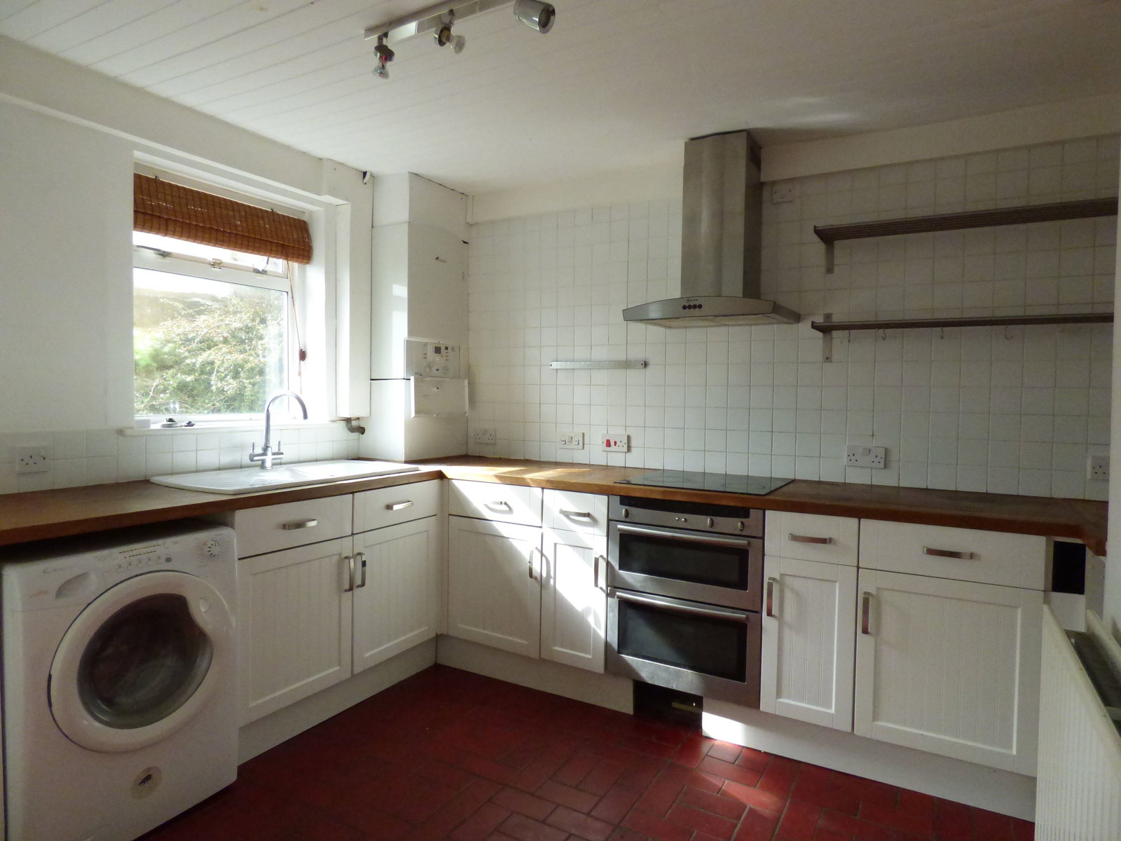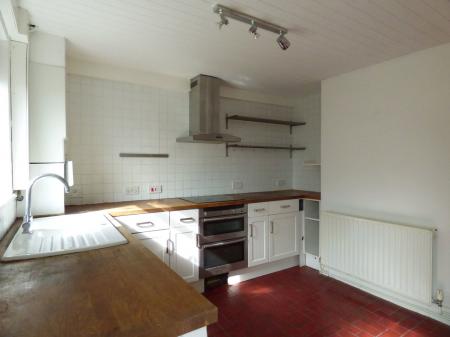 Immediately accessed via the front door and having and open wooden balustraded staircase to first floor with useful storage recess under. Range of drawer and cupboard base units with a butchers block style wooden worktop over. Set beneath a double glazed window is a one and a half bowl ceramic sink with mixer tap. Integrated four ring electric HOB with extractor over and OVEN below. Useful storage cupboard, tiled splashbacks, tiled floor, ceiling light point, wall mounted central heating boiler and door to
