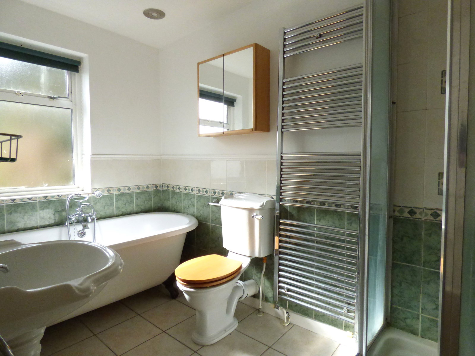 Fitted with a white, Victorian style sink with roll edged bath with mixer tap and shower head fitment, low level WC and separate shower enclosure with thermostatically controlled shower over. Downlighters and wall mounted chrome heated towel rail. Wall mounted extractor fan, tiled floor and splashbacks and obscured double glazed window to side.