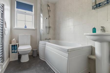 Vinyl tiled flooring, panelled bath with shower, pedestal wash hand basin, close coupled WC, chrome heated towel rail, obscured double glazed window, ceiling light fitting.