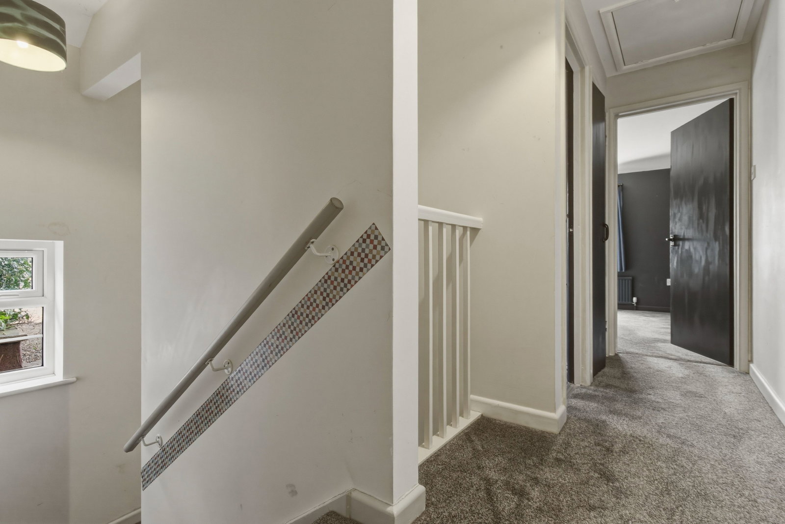 Carpet, doors to all rooms, loft access point. glazed window on the stairs and airing cupboard.