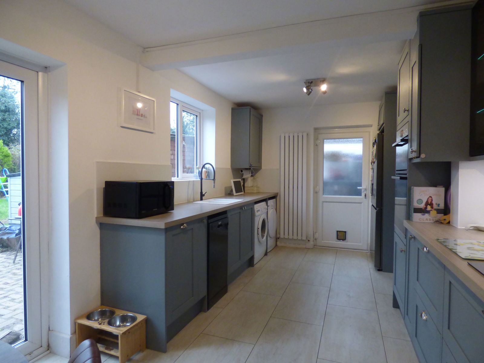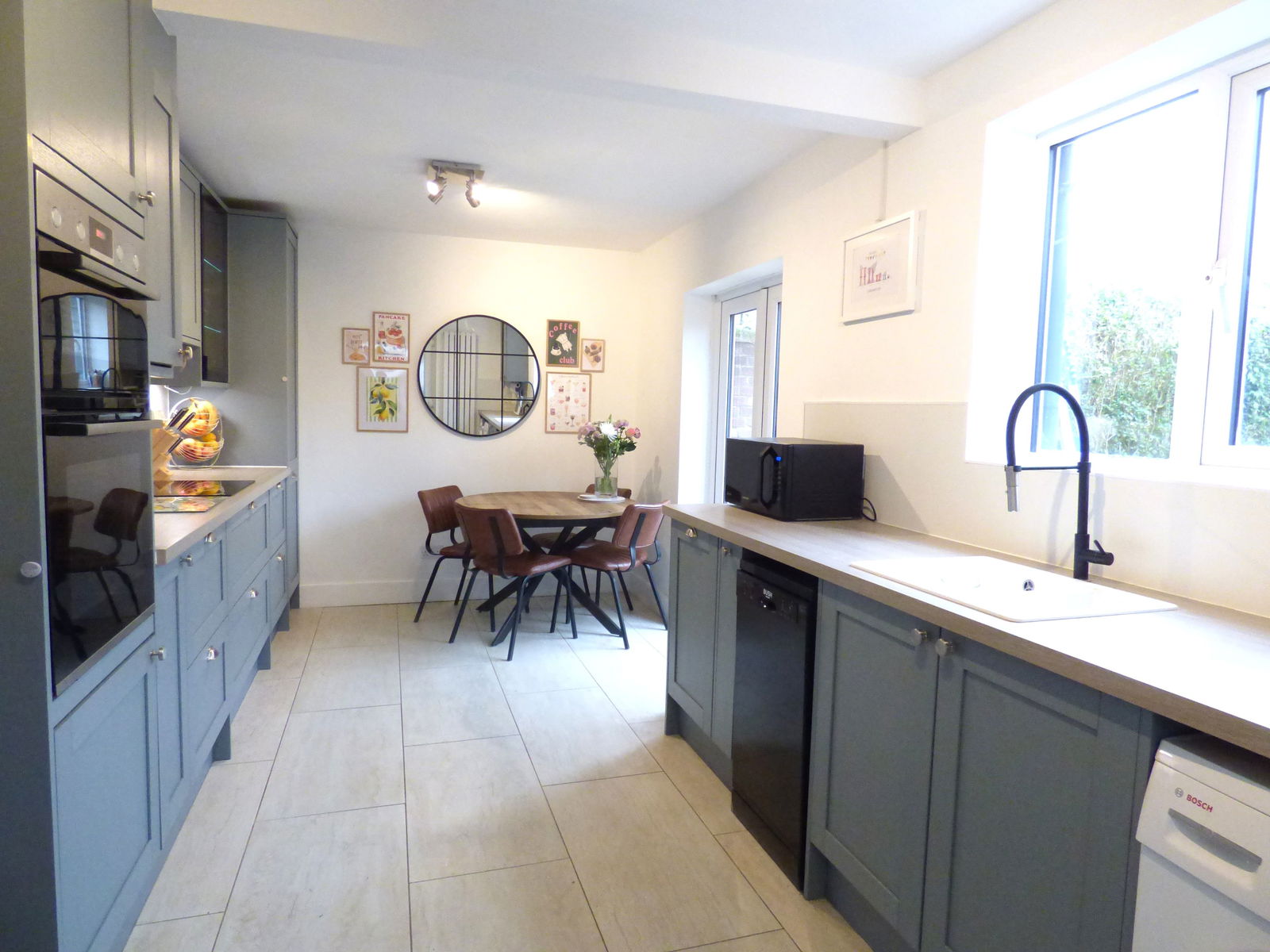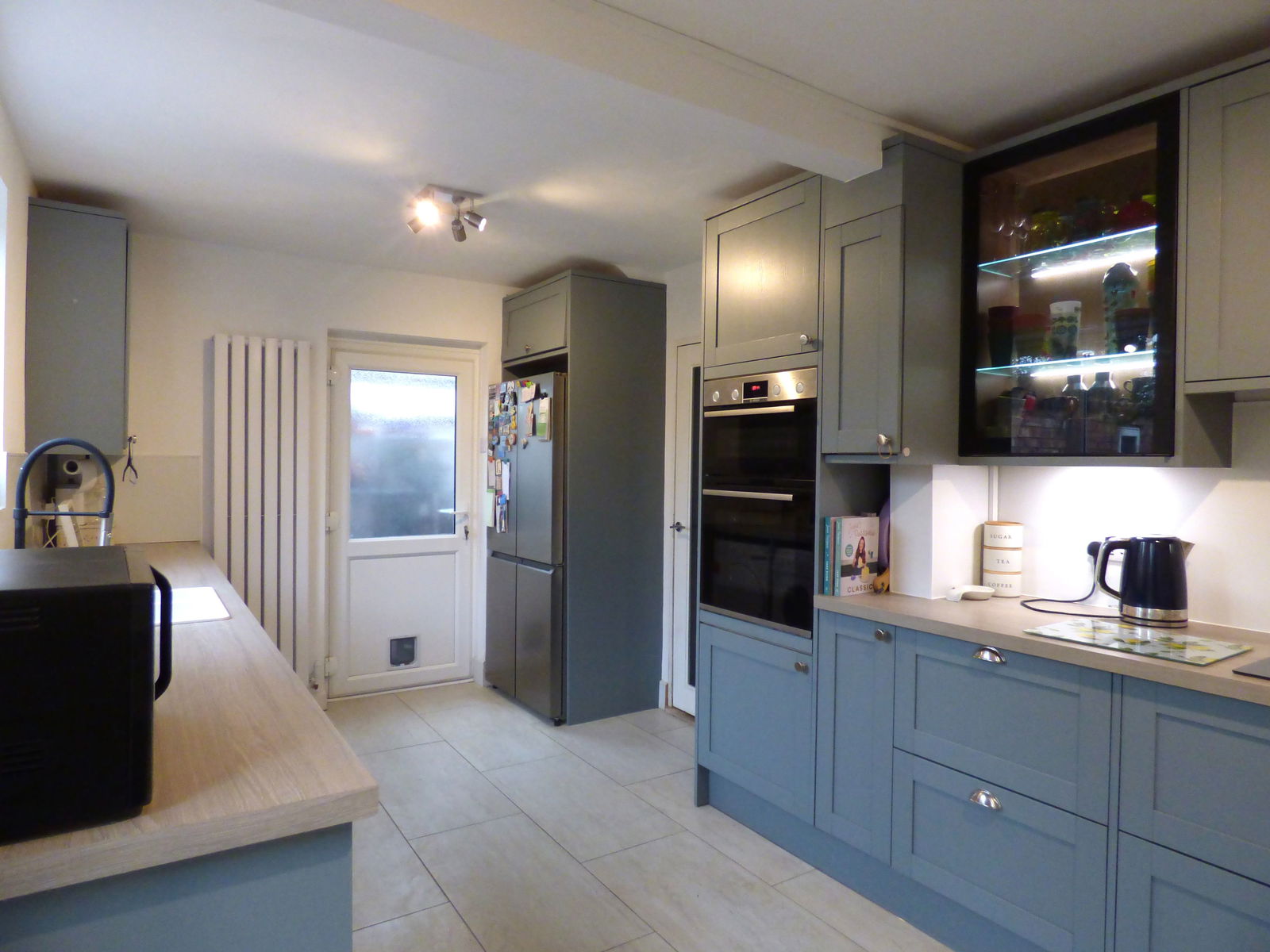 Refitted approximately two years ago with a range of shaker style drawer and cupboard base units with worktop over and matching wall units incorporating glass display cabinets. Range of integrated appliances including a Bosch four ring electric HOB with extractor over and eye level DOUBLE OVEN. Undercounter slimline dishwasher and space and plumbing for a washing machine, tumble drier and an American style fridge freezer. Large larder style drawer. Bin drawer with pull out spice rack to side. Double glazed French doors open to the rear garden. Set beneath the double glazed window is a one and half bowl sink unit with flexy mixer tap. Modern vertical radiator and tiled floor that flows throughout this area and into the dining space. Two ceiling light points. Door to;