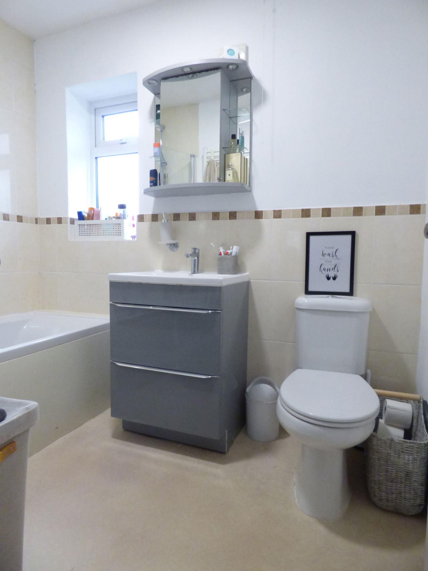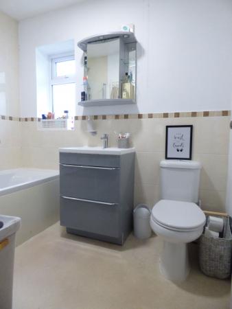 Fitted with a white low level WC and vanity wash hand basin with mixer tap and drawers under. Panelled bath with mixer tap and thermostatically controlled hand held shower over. Tiled splashbacks, ceiling light point and wall mounted extractor fan. Obscured double glazed windows to front and side and wall mounted heated towel rail.