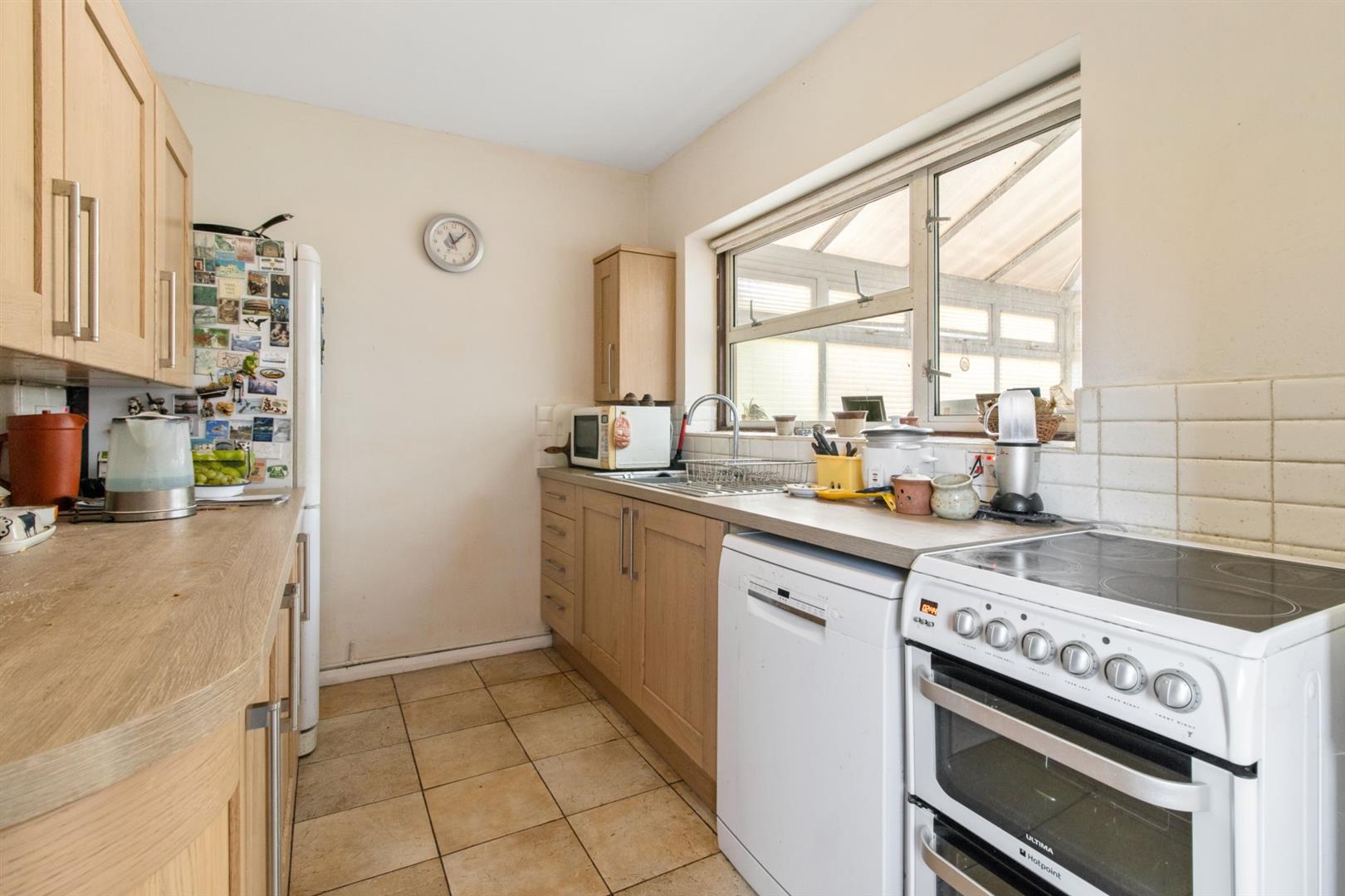 4m x 2.4m - Obscure double glazed door into porched area (housing wall mounted gas boiler) and door to WC. Kitchen fitted with a range of wood effect wall and base units with square edged work surface over. Stainless steel sink and drainer with tiled splash back.Space for fridge freezer, oven and dishwasher. Tiled flooring. Radiator. Double glazed internal window overlooking conservatory with part-glazed door into conservatory.