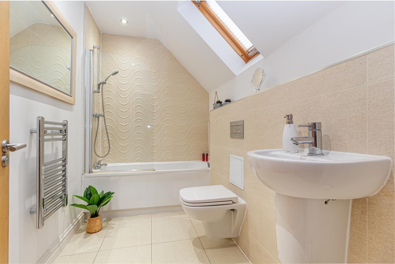 Panelled bath with shower over and glazed screen. WC and basin. Chrome heated towel rail. Tiled floor and walls. Skylight window.