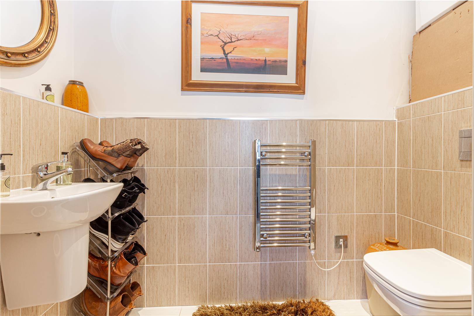 Basin, WC and chrome heated towel rail. Wall mounted Ideal Boiler. Tiled floor and walls. Ceiling spotlights.