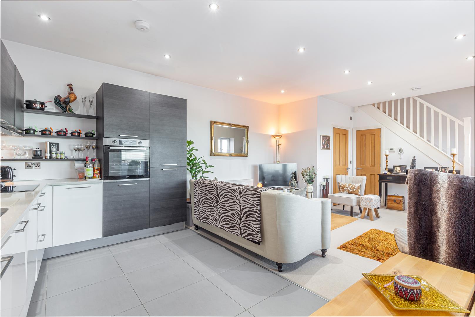 Stunning bi-fold doors enjoying far reaching views with double glazed window to the front aspect. Laid to carpet with stairs rising to first floor. Ceiling spotlights and radiator. Understairs storage cupboard.