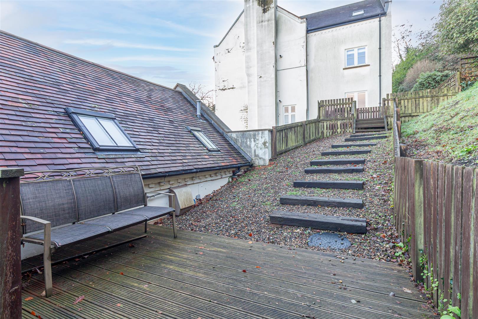 The outdoor space is a blank canvas with enormous potential, featuring decked and gravelled areas that lead to a raised viewing platform. A sloping grassy bank could be transformed with planting and colourful shrubs, creating a beautiful and tranquil retreat.
