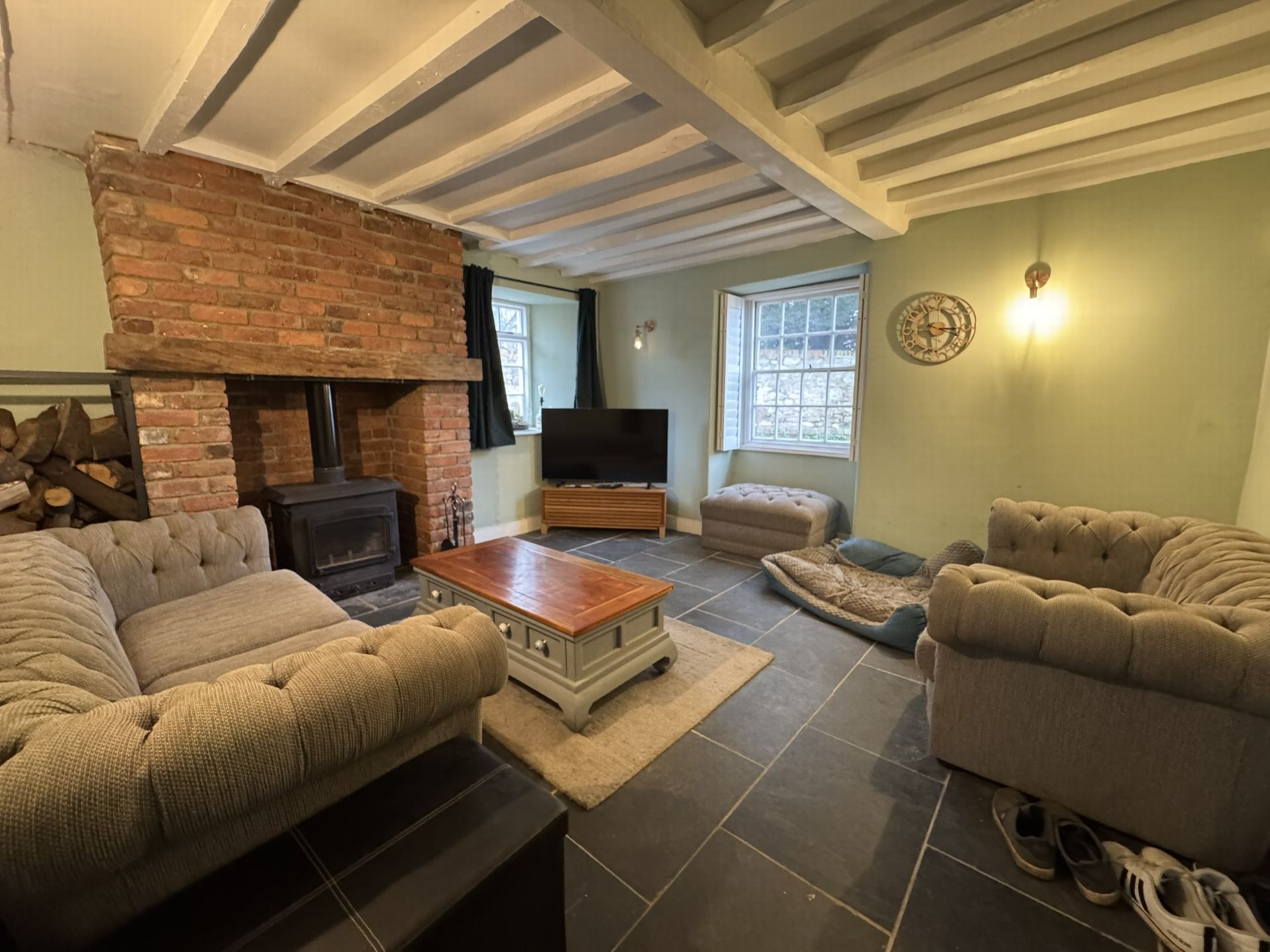 LOUNGE: Feature beamed ceiling, wood burner with brick surround, window to the front and side of the property, tiled floor and electric radiator. door to: