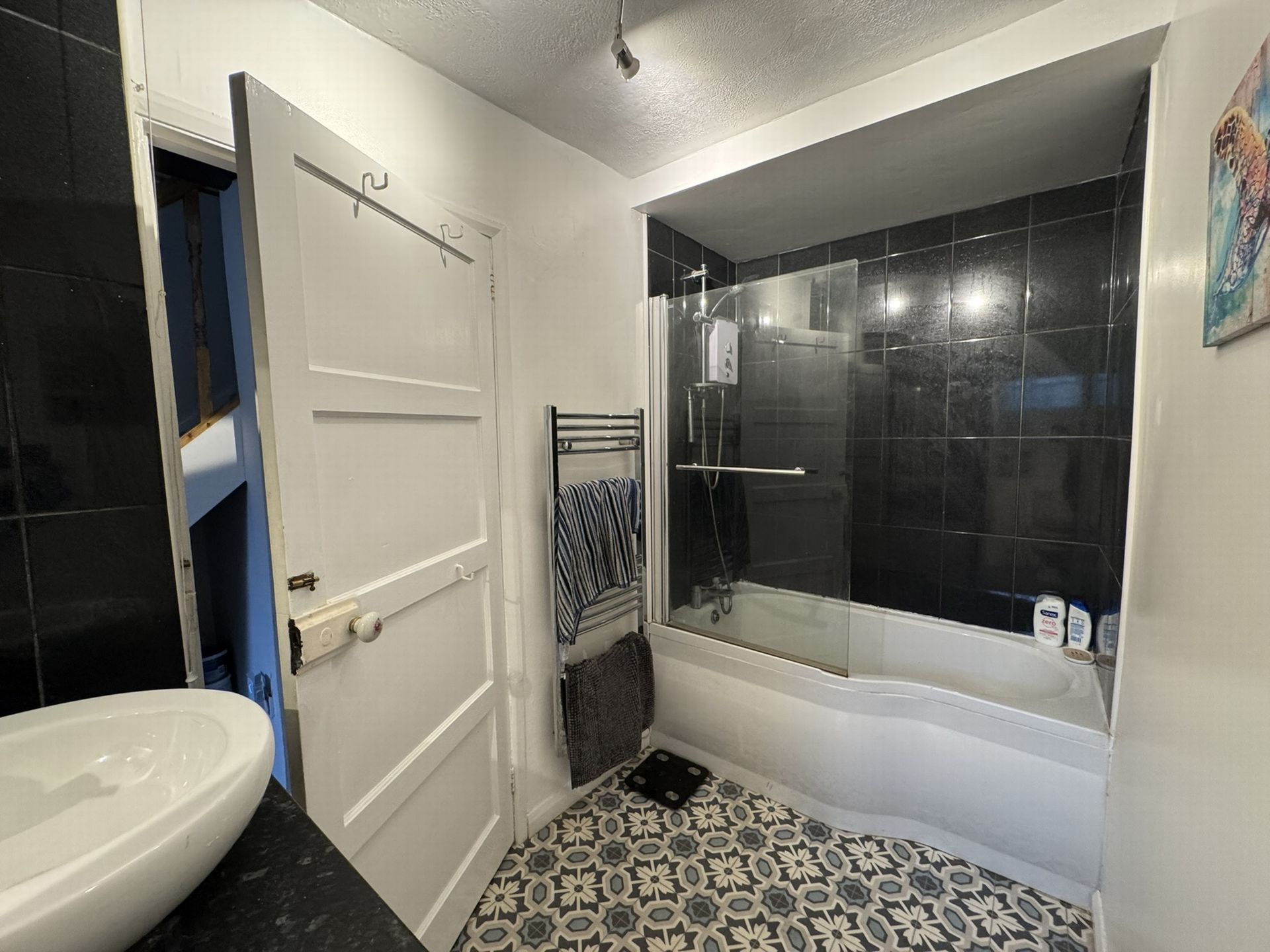 BATHROOM: Suite comprising bath with shower and glass screen over, wash hand basin, WC, electric heated towel rail and window to the rear.
