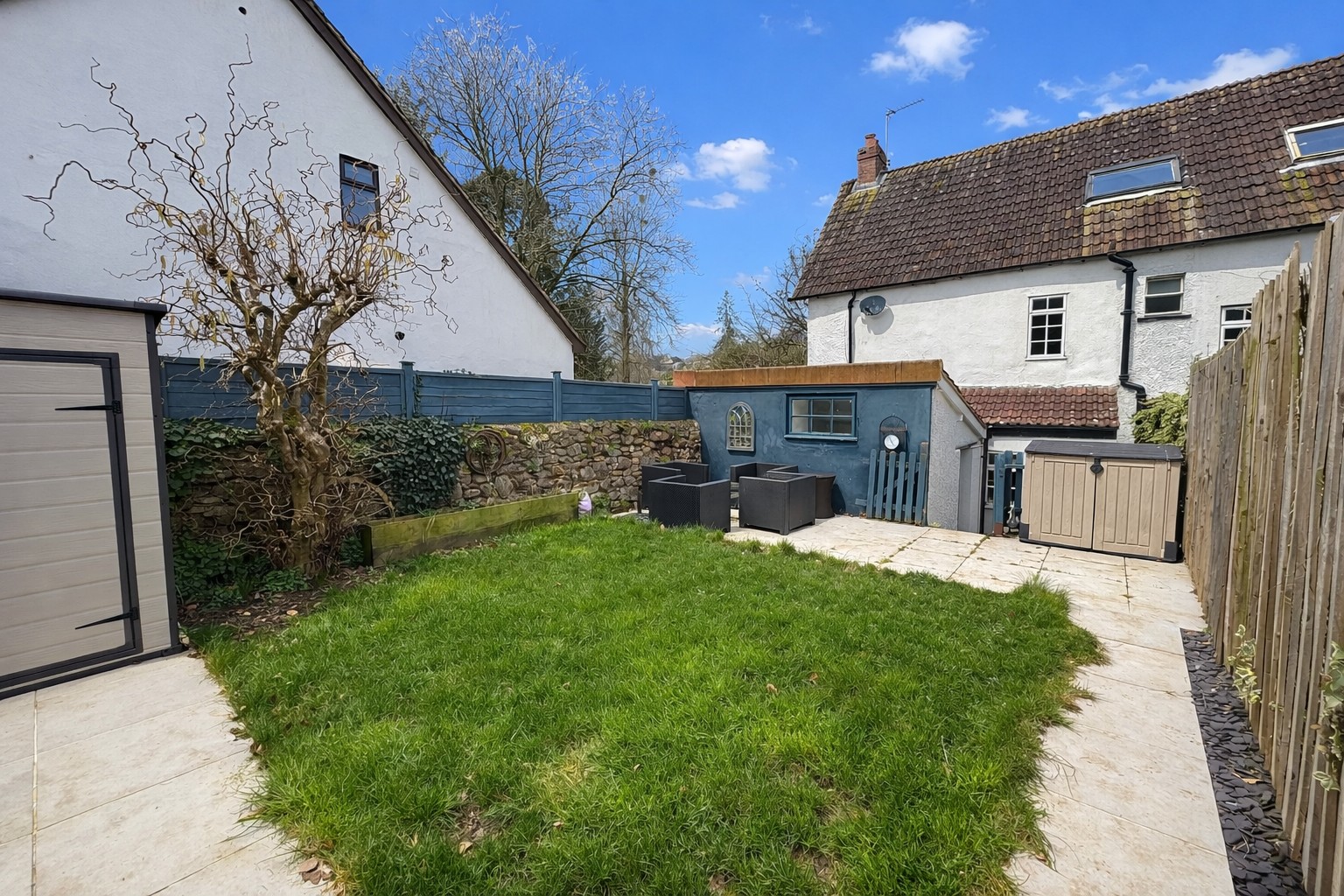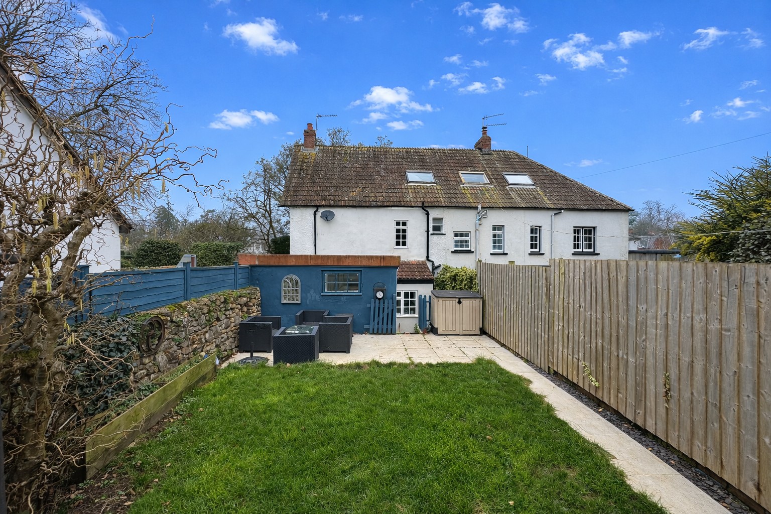 OUTSIDE: To the front is a part walled courtyard garden with gate and path leading to the front door. To the side is a small courtyard garden with side access whilst to the rear is a good size garden with southerly aspect, level lawn, patio and a good degree of privacy.