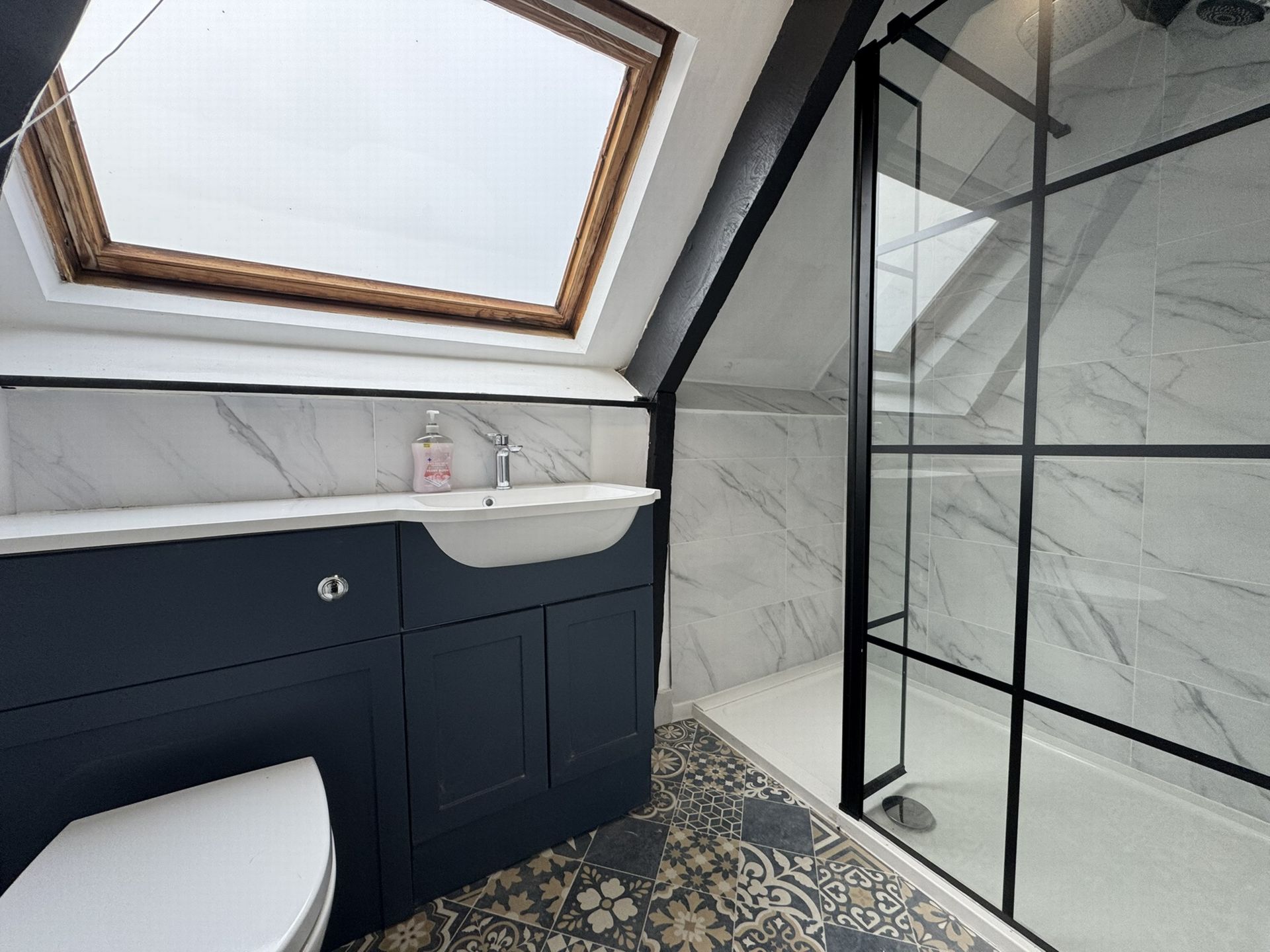 SHOWER ROOM: A lovely modern shower room with walk in shower, wash hand basin and WC set in a storage unit with work surface over and Velux style window to the rear.