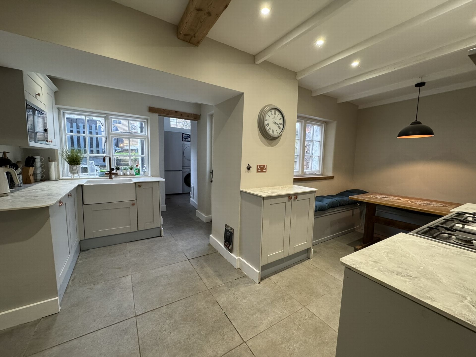 KITCHEN/DINING ROOM: Modern matching base and eye level units with work surfaces over, Belfast style sink, space for a range style cooker, windows to the rear, tiled floor, door to the side courtyard and further door leading to the rear garden, access to a useful utility area and door to: