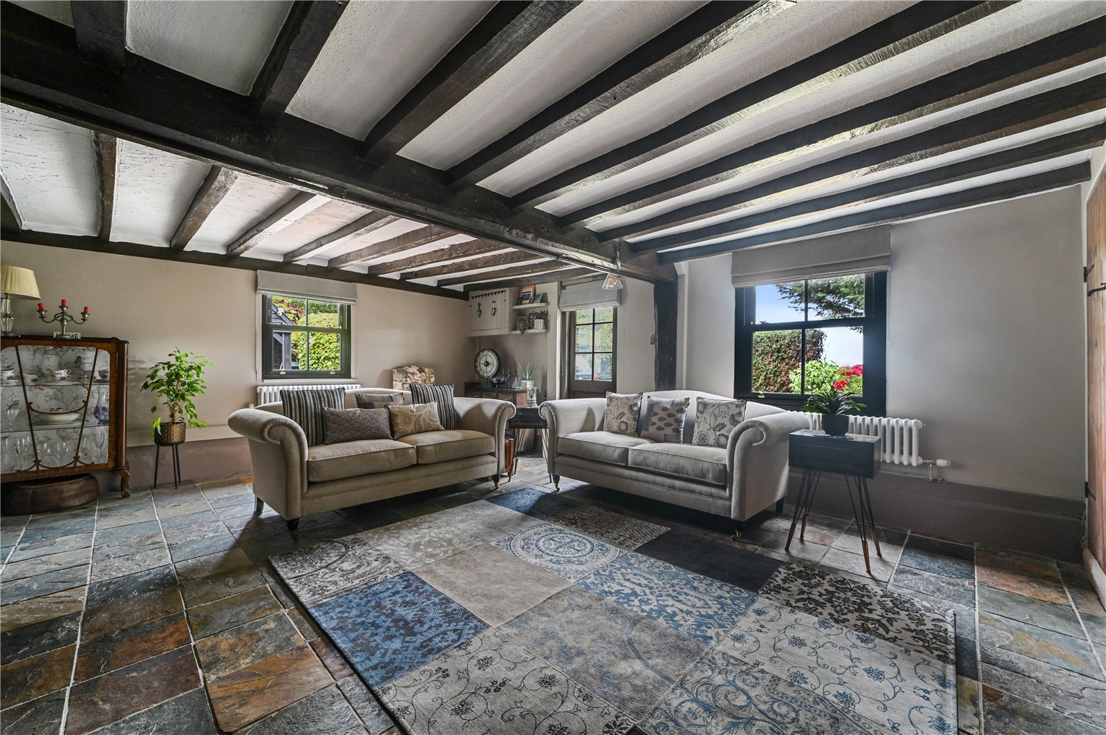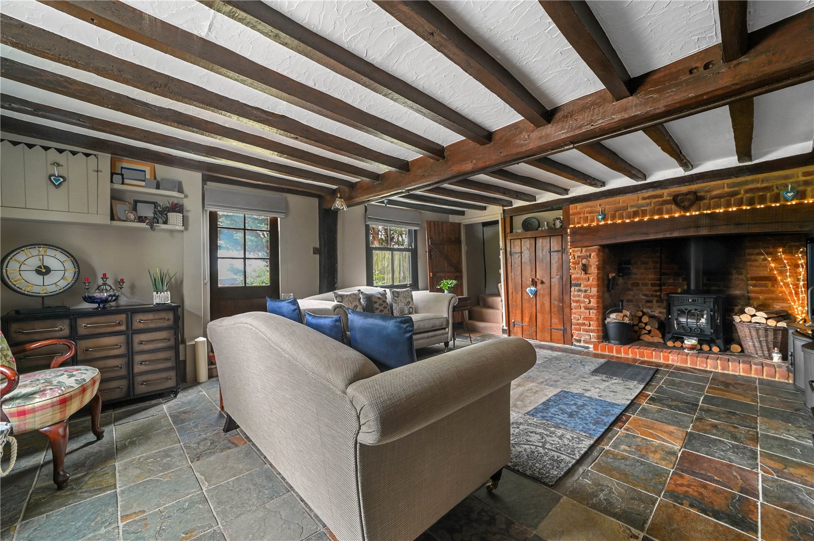 Once inside, the ground floor of this charming home unfolds with a blend of historic charm and modern design, offering a well-considered layout that delivers both character and functionality. The original cottage opens into a welcoming sitting room where exposed beams and a large inglenook fireplace with wood-burning stove create an inviting atmosphere. Natural slate flooring underfoot complements the period features, while deep-set windows frame garden views and allow light to gently filter through the space.