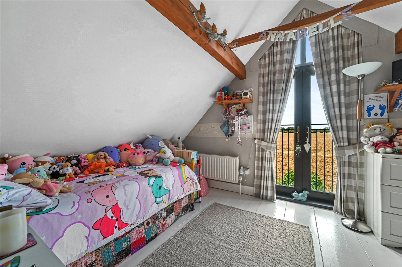 The first floor offers four comfortable bedrooms and a family bathroom, all arranged to make the most of the property’s distinctive blend of period character and modern design. Timber beams, vaulted ceilings, and exposed trusses feature throughout, creating a cohesive feel. Angled ceilings and deep window reveals add texture and charm, while thoughtful placement of windows ensures each room is bright and enjoys either garden or far-reaching rural views.