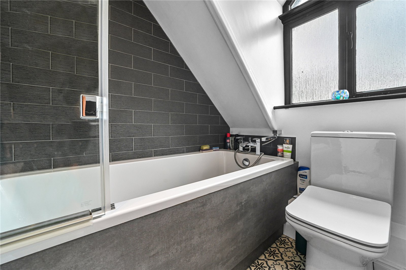The family bathroom is fitted in a modern style with clean lines and contemporary tiling, set beneath a sloping ceiling that adds to the sense of character without compromising comfort.