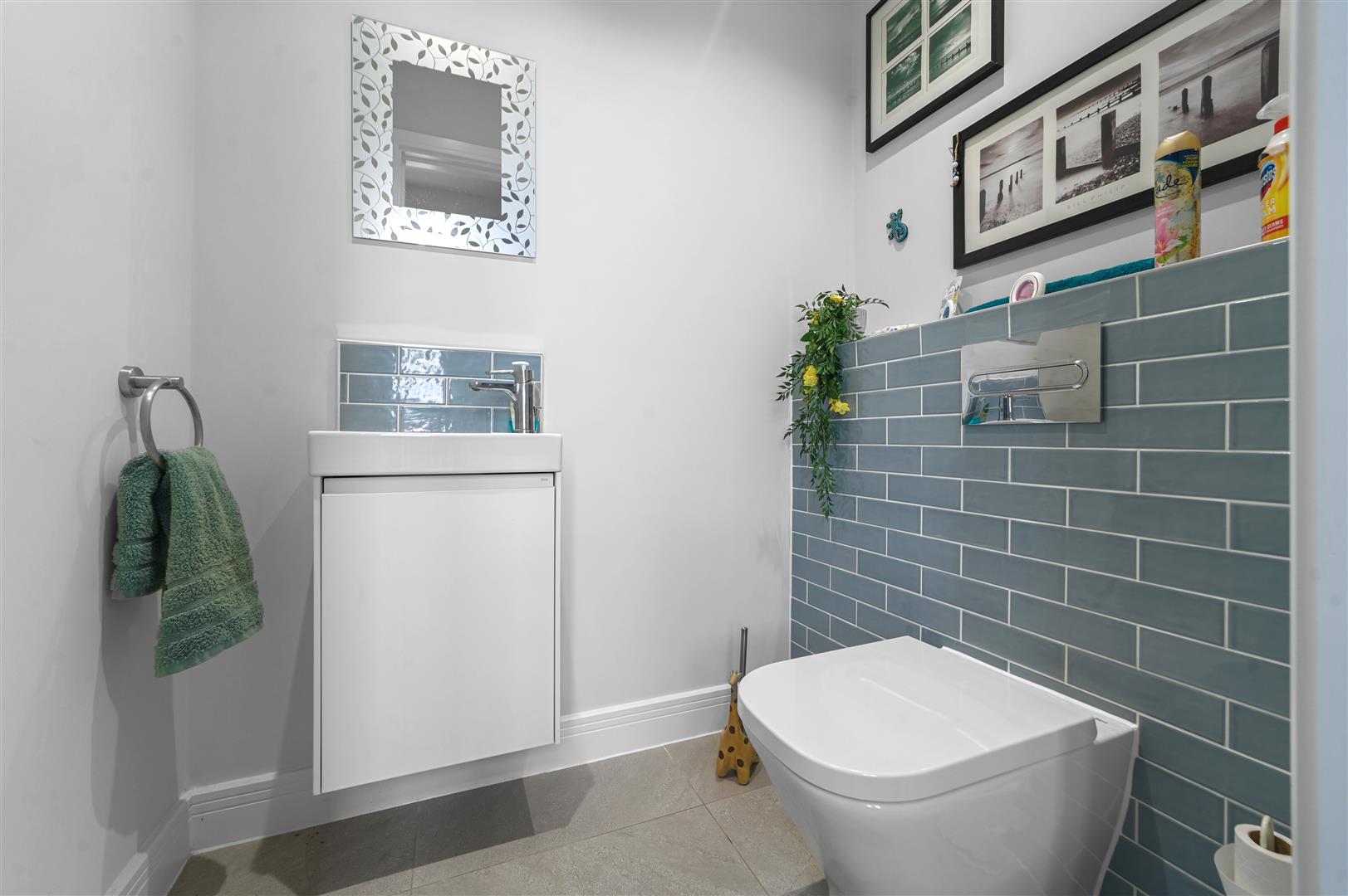 At the heart of the home is a bright open-plan living area with double doors leading to the rear garden. There is a beautiful kitchen, featuring high-quality integrated appliances and a handy storage cupboard. A ground-floor cloakroom adds further convenience to the well-considered layout.