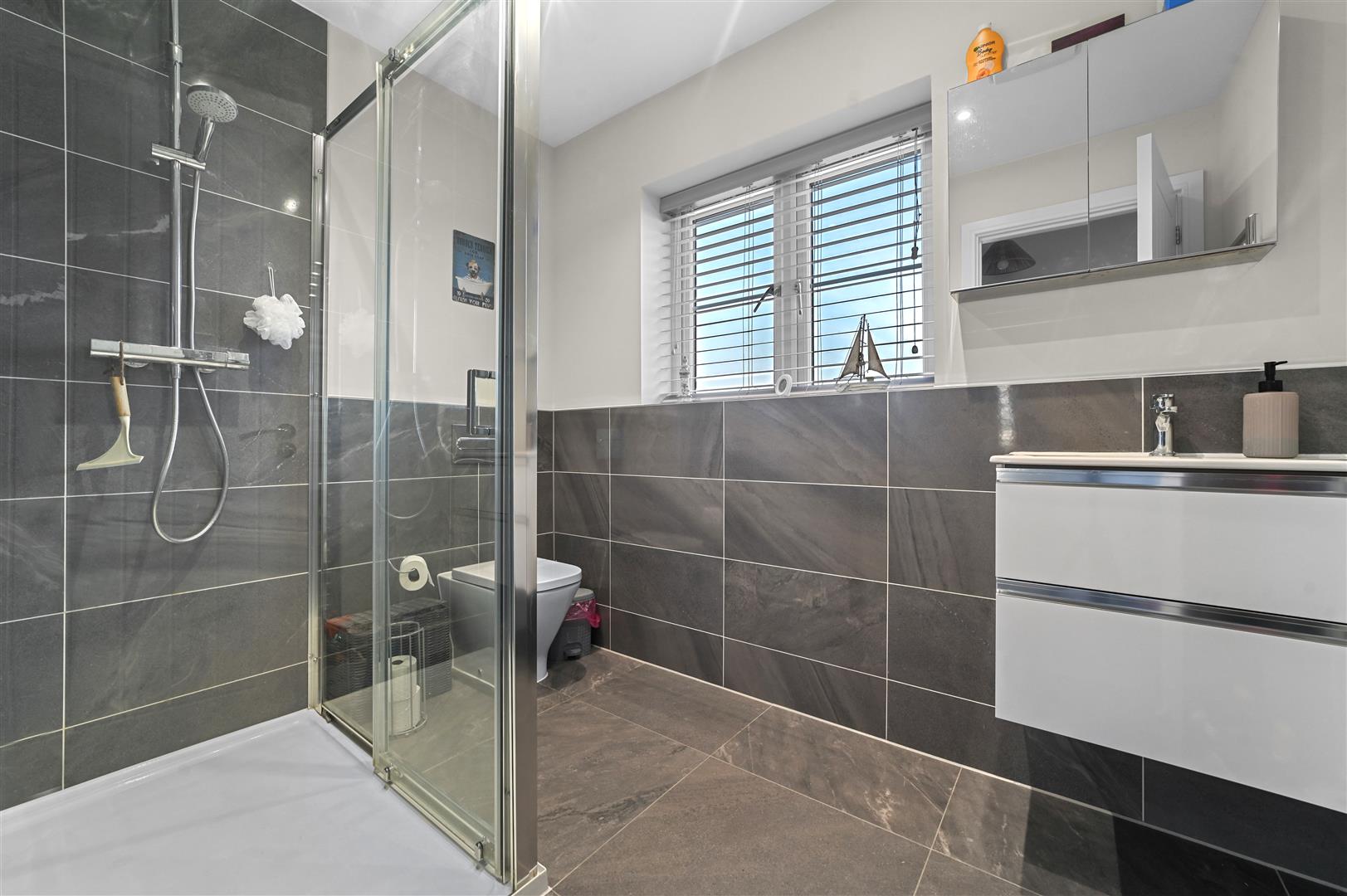 Upstairs, the property offers three well-proportioned bedrooms. The principal bedroom includes fitted wardrobes, providing both elegance and smart storage solutions, while a contemporary shower room serves this floor.