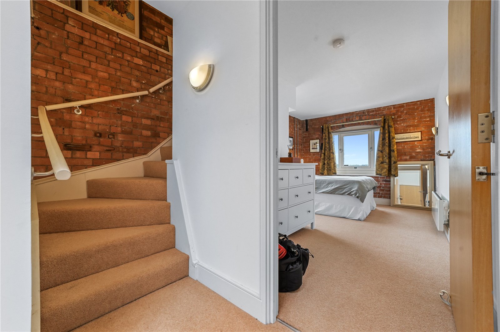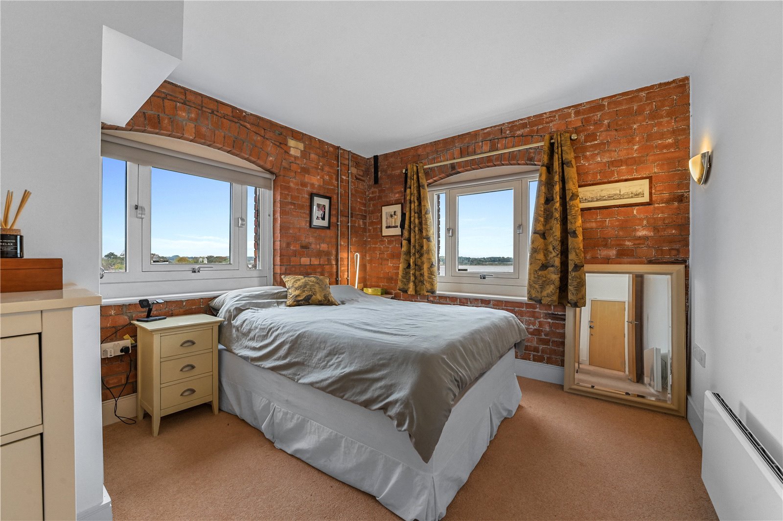 The main bedroom offers a generous layout with dual aspect windows that frame far-reaching estuary views. Exposed brickwork continues the industrial heritage of the building, while the room's proportions and natural light make it a calm and inviting retreat.