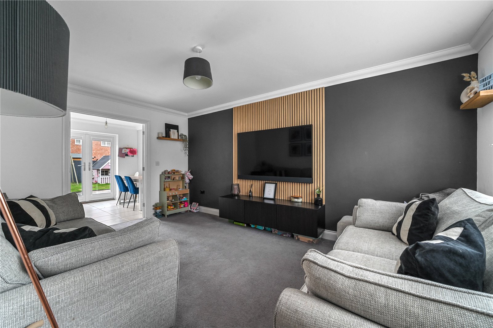 Upstairs, the main bedroom is generously proportioned and features its own ensuite shower room, offering a private and well-appointed space. Two further bedrooms provide flexible accommodation, well-suited for family use or home working. The first floor also includes a modern family bathroom with a clean, neutral finish, and a central landing that links the space together effectively.