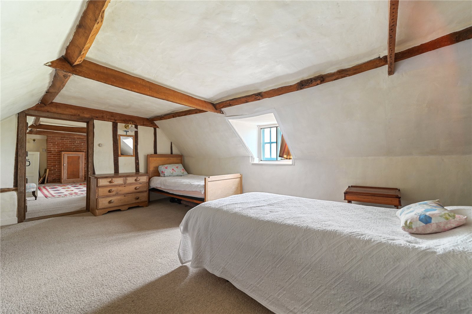 Two separate staircases, one from each end of the property - lead to the second floor, where two spacious attic bedrooms are nestled beneath the original beams. These rooms have a wonderful sense of character, with exposed brickwork, sloping ceilings, and dormer windows that add to their charm. With an abundance of space and a tucked-away feel, they offer versatile accommodation, whether as additional bedrooms, workspaces, or a secluded hideaway for relaxation. The entire upper floor showcases the farmhouse’s rich history while providing ample flexibility for modern family living.