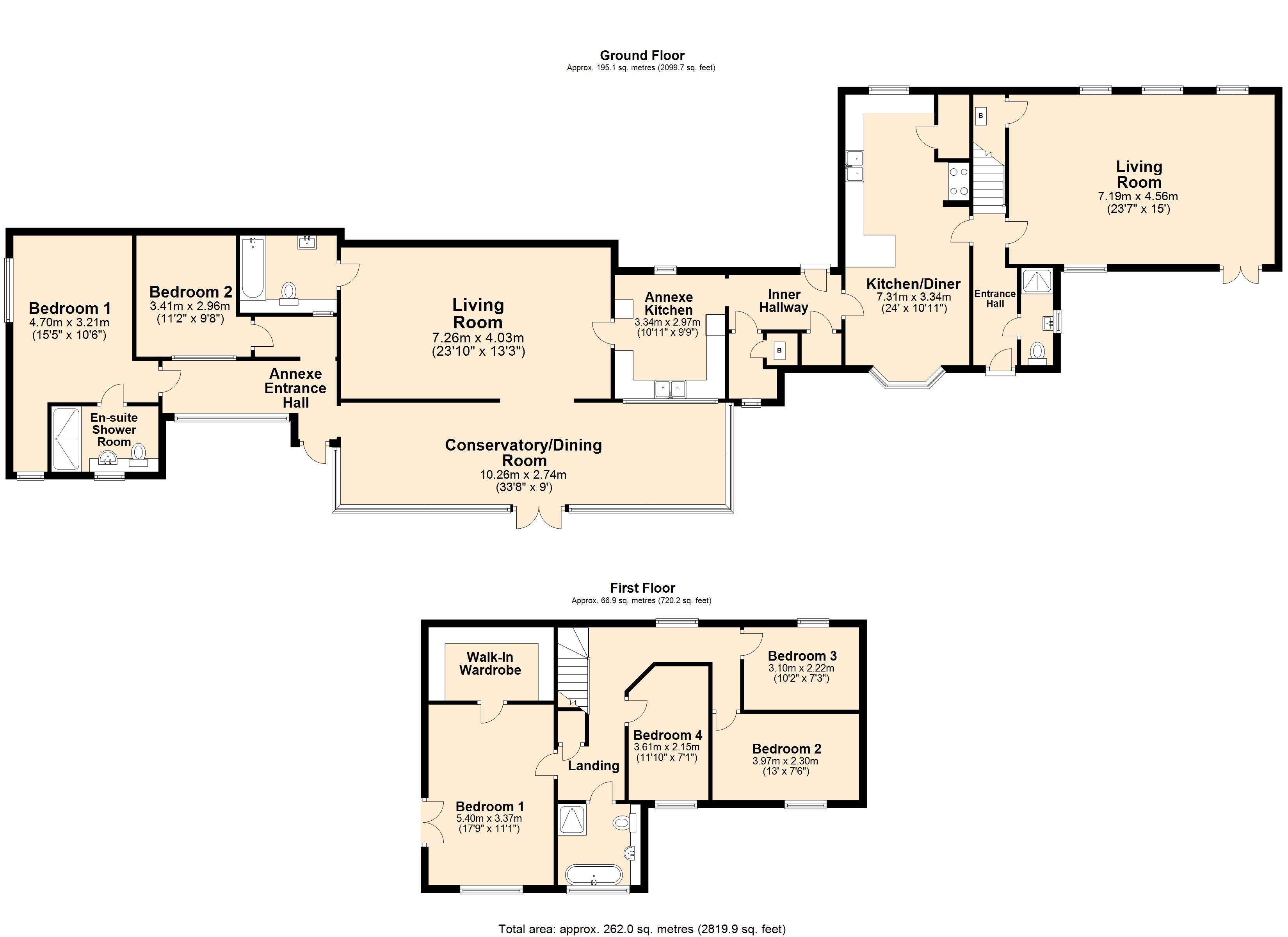 The annexe has its own private entrance and an interconnecting door to the main house providing the flexibility of using the property as a large single dwelling or a home for multi-generational living. The annexe accommodation is particularly generous with a spacious living room opening to a 33’ conservatory/dining room featuring a double sided wood burning stove. There is also a modern fitted kitchen and two double bedrooms one of which has a large en-suite shower room.