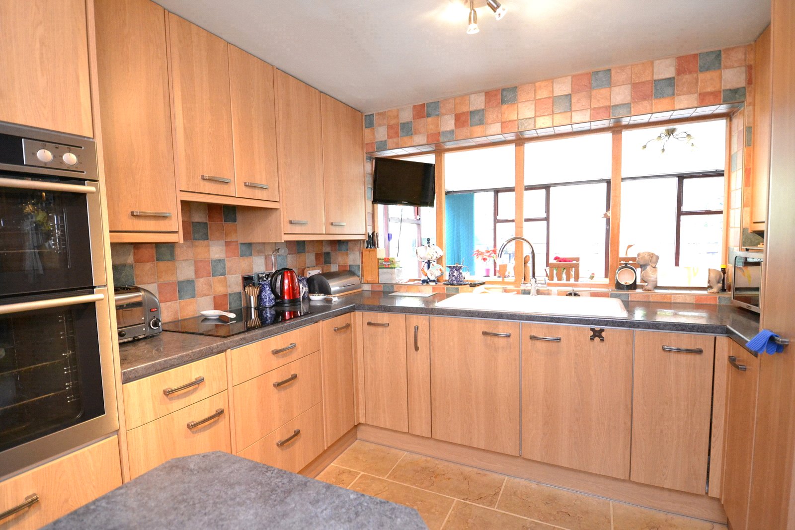 KITCHEN: 11’ x 9’9” Modern fitted kitchen comprising inset 1½ Belfast sink with cupboard below, further range of wall, drawer and base units with work surface over, tower unit with built-in double oven, inset induction hob, tiled floor and door to: