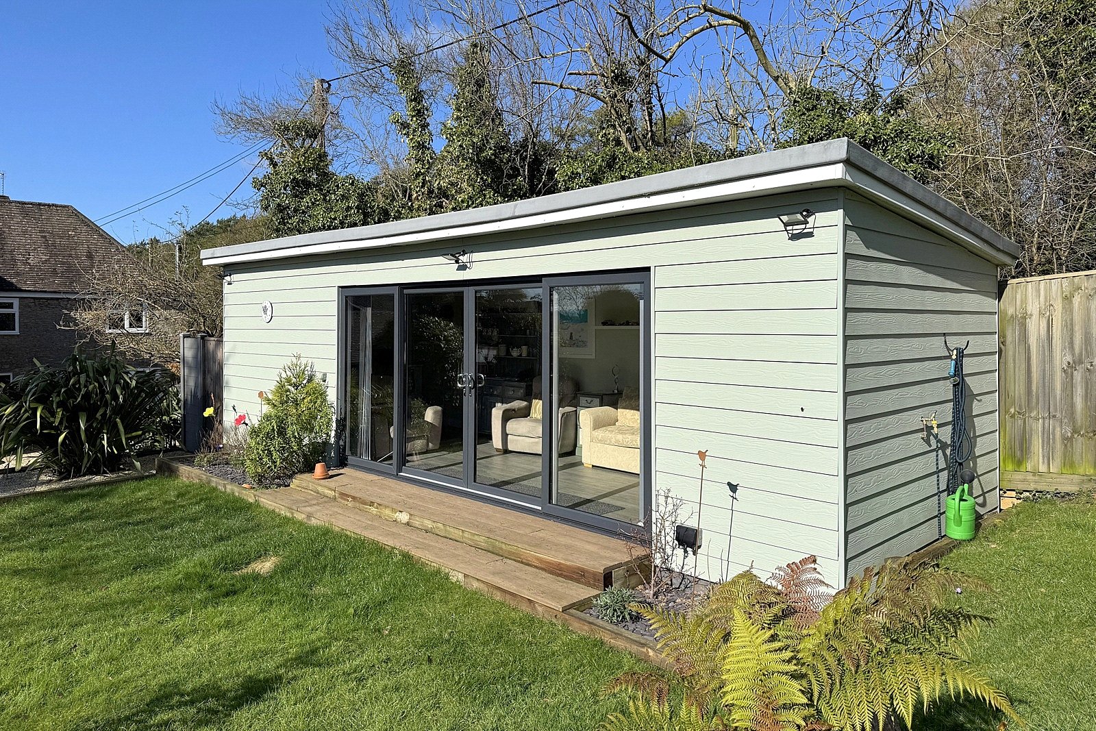 The large secluded garden is positioned to the front of the property with a long sweeping driveway providing parking for many vehicles. Railway sleeper steps lead up to a generous lawned area with various shrubs interspersed throughout the garden. An area of decking provides the ideal setting for al fresco dining and entertaining, and a large cabin (29’ x 9’2”) is the perfect garden room to sit and relax or entail for a wonderful home office. There are also numerous timber sheds, log store and large timber garage/workshop (18’9” x 18’7”) with light and power.