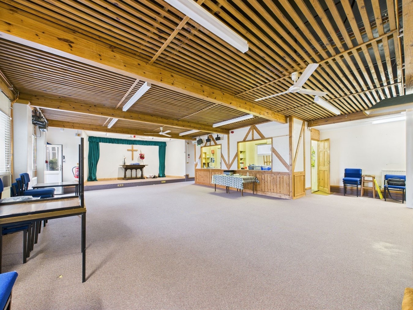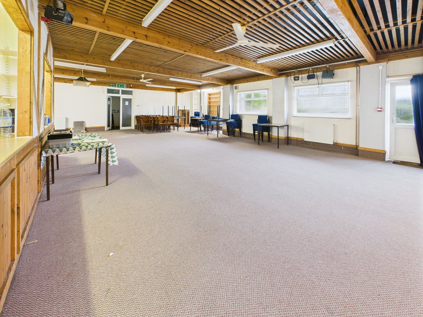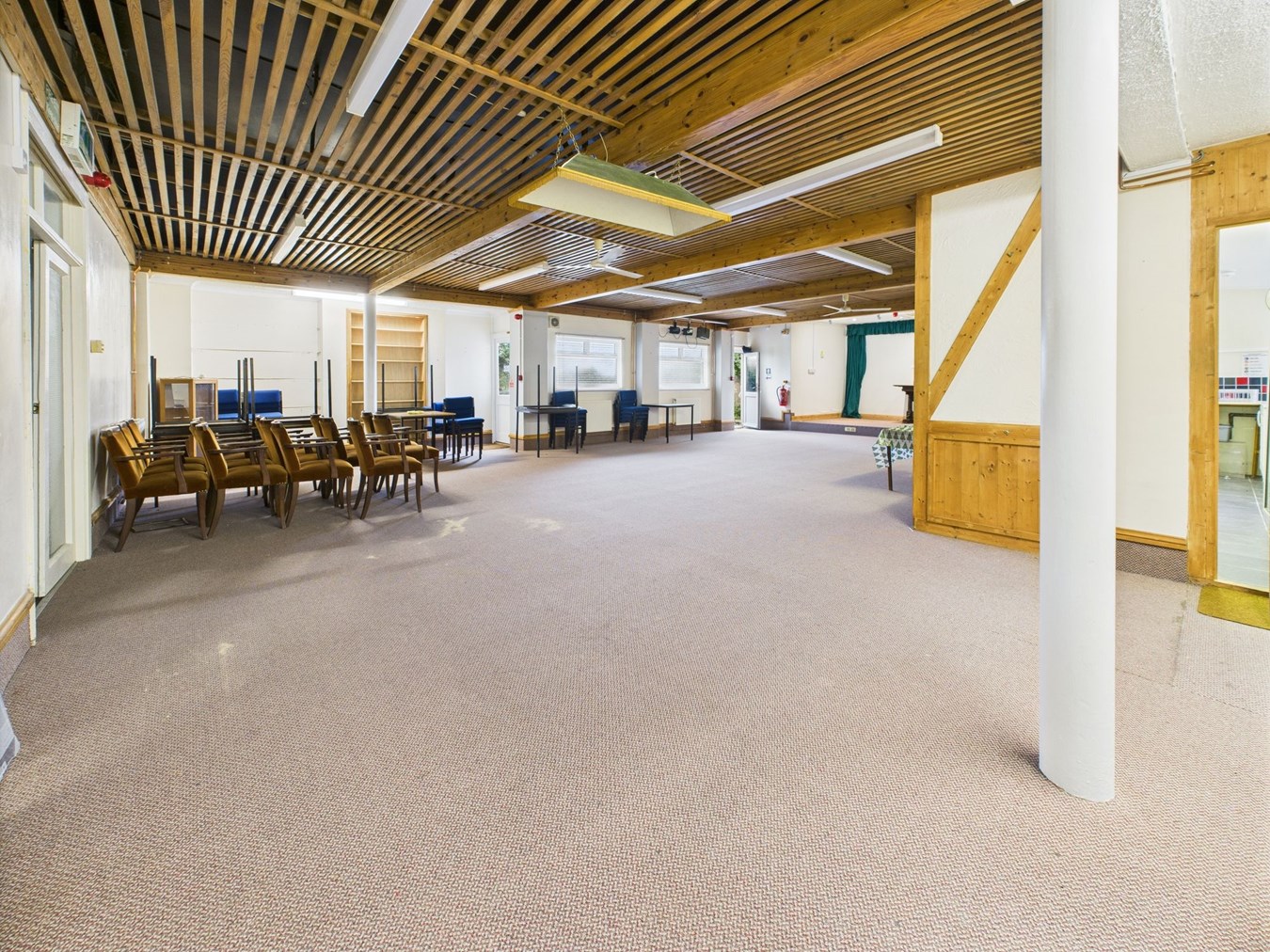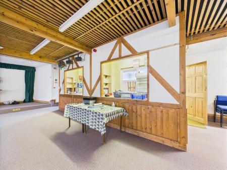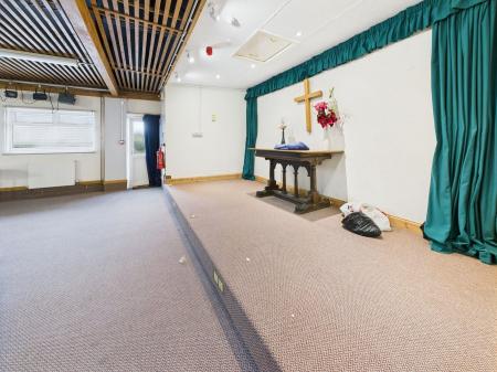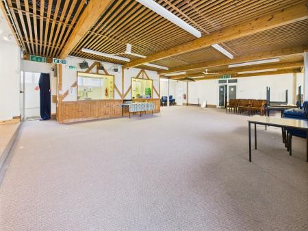 11.26m x 10.00m max (36' 11" x 32' 10") With two double glazed windows to side. Two doors leading to an external side passageway leading to the gents W.C. Radiators. Strip lighting. Step up to low level stage area measuring 4.53m x 2.10m (14'10" x 6'10"). Doorway and two open hatches to kitchenette/bar.