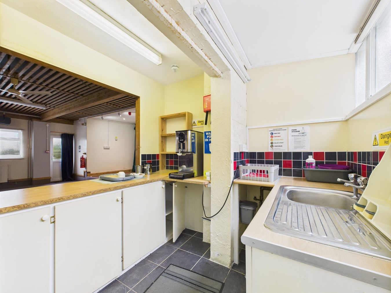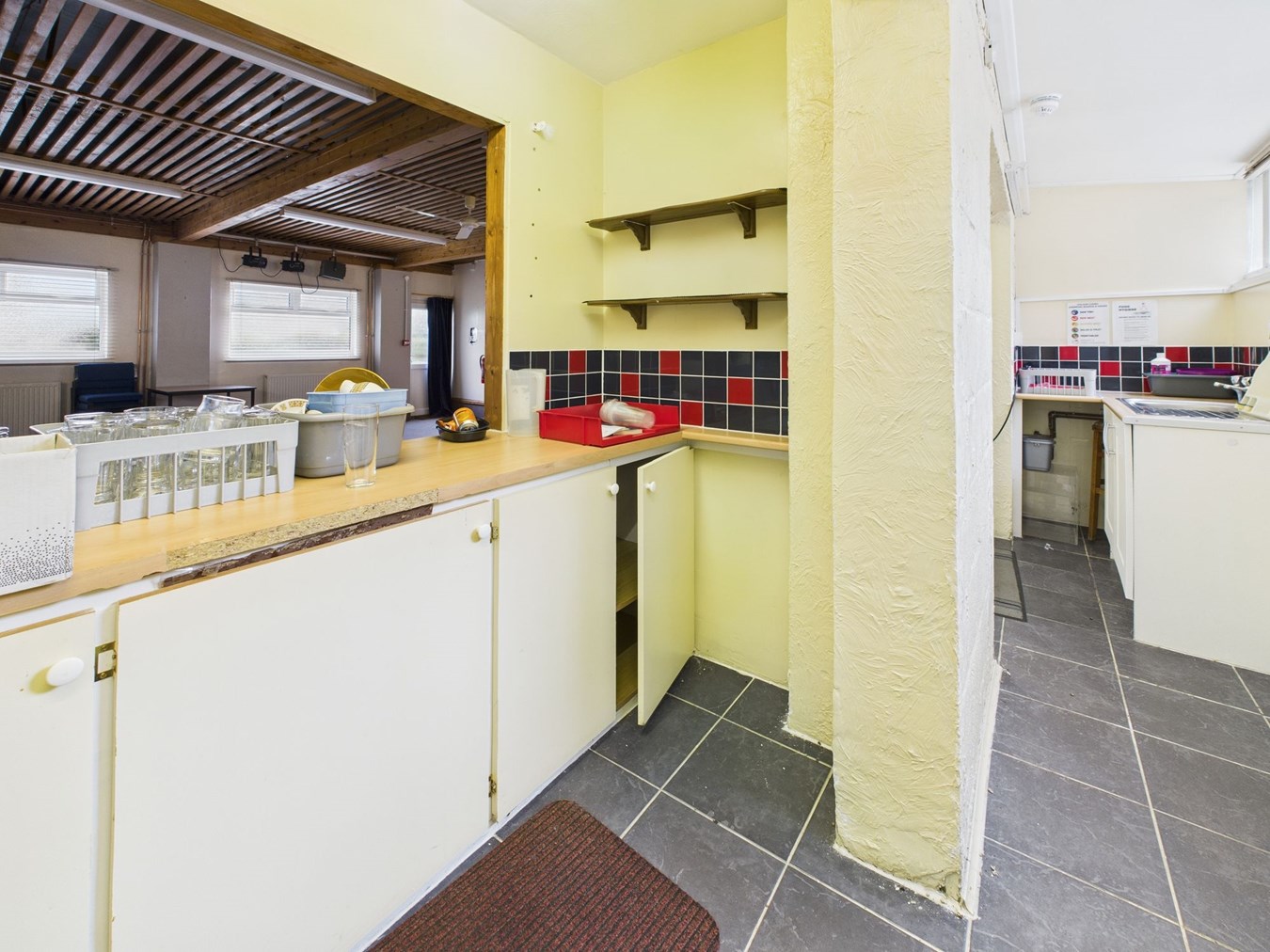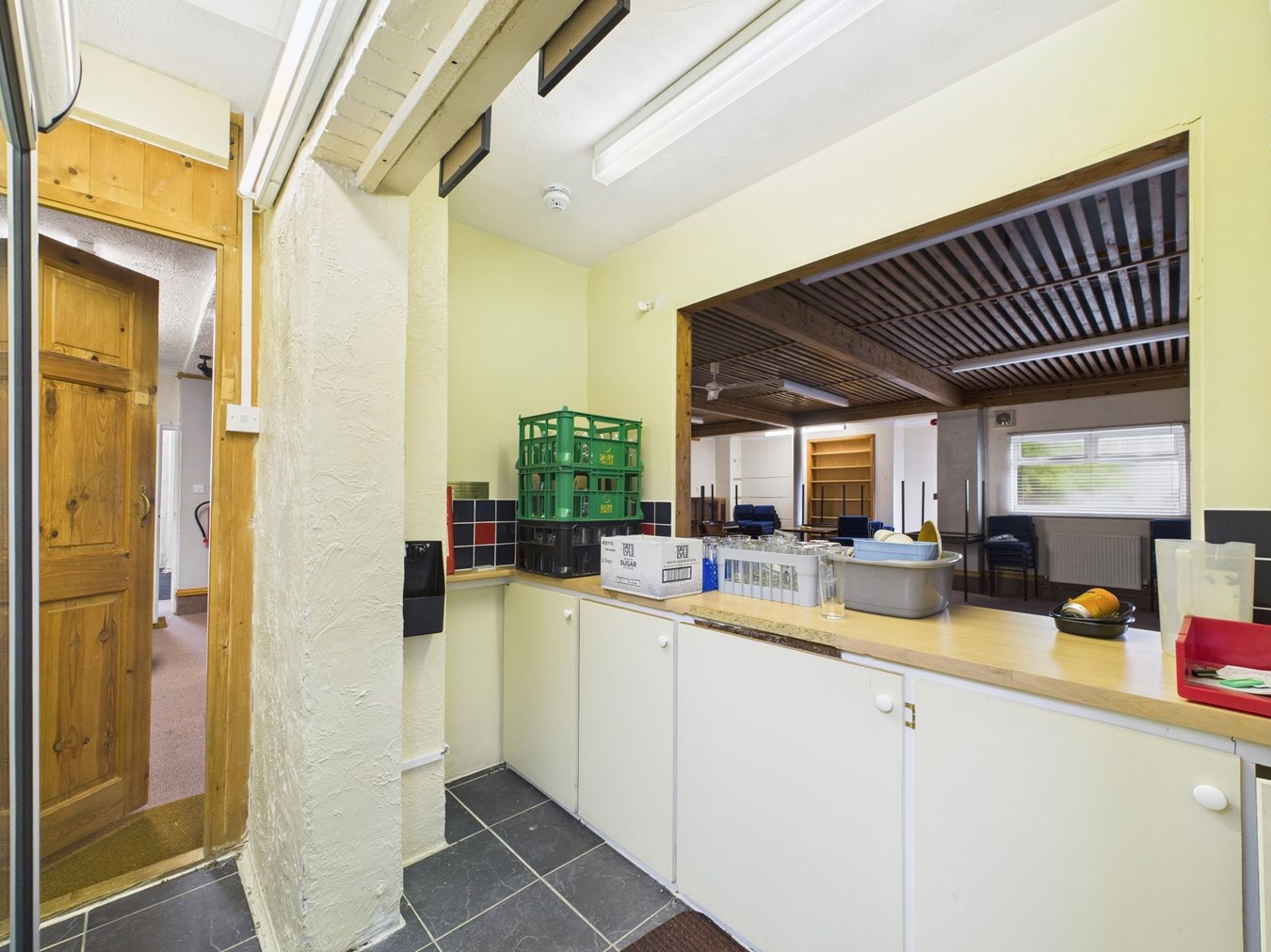 11.26m x 10.00m max (36' 11" x 32' 10") With two double glazed windows to side. Two doors leading to an external side passageway leading to the gents W.C. Radiators. Strip lighting. Step up to low level stage area measuring 4.53m x 2.10m (14'10" x 6'10"). Doorway and two open hatches to kitchenette/bar.