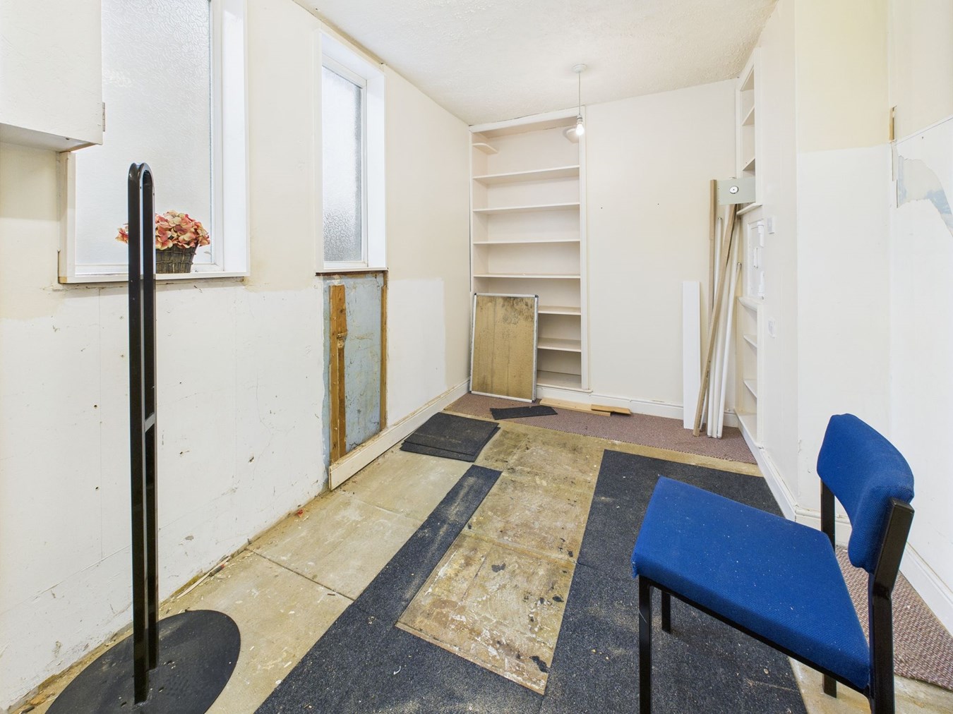 3.67m x 2.16m (12' 0" x 7' 1") With two obscure double glazed window to front. Fitted shelves to alcoves. Cupboard housing electric meter.