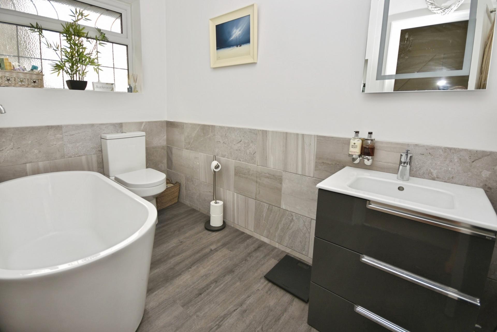 Upstairs, there are four generously proportioned bedrooms and a newly fitted bathroom featuring a freestanding bath with shower mixer tap, Rocca vanity unit, and quality half tiling. Karndean LVT flooring has been laid throughout the kitchen/dining room, bathroom, and cloakroom, while Farrow & Ball colours create a timeless finish. The home also benefits from an upgraded Vaillant heating, mains fed unvented hot water system cleverly housed in an attached plant room.
