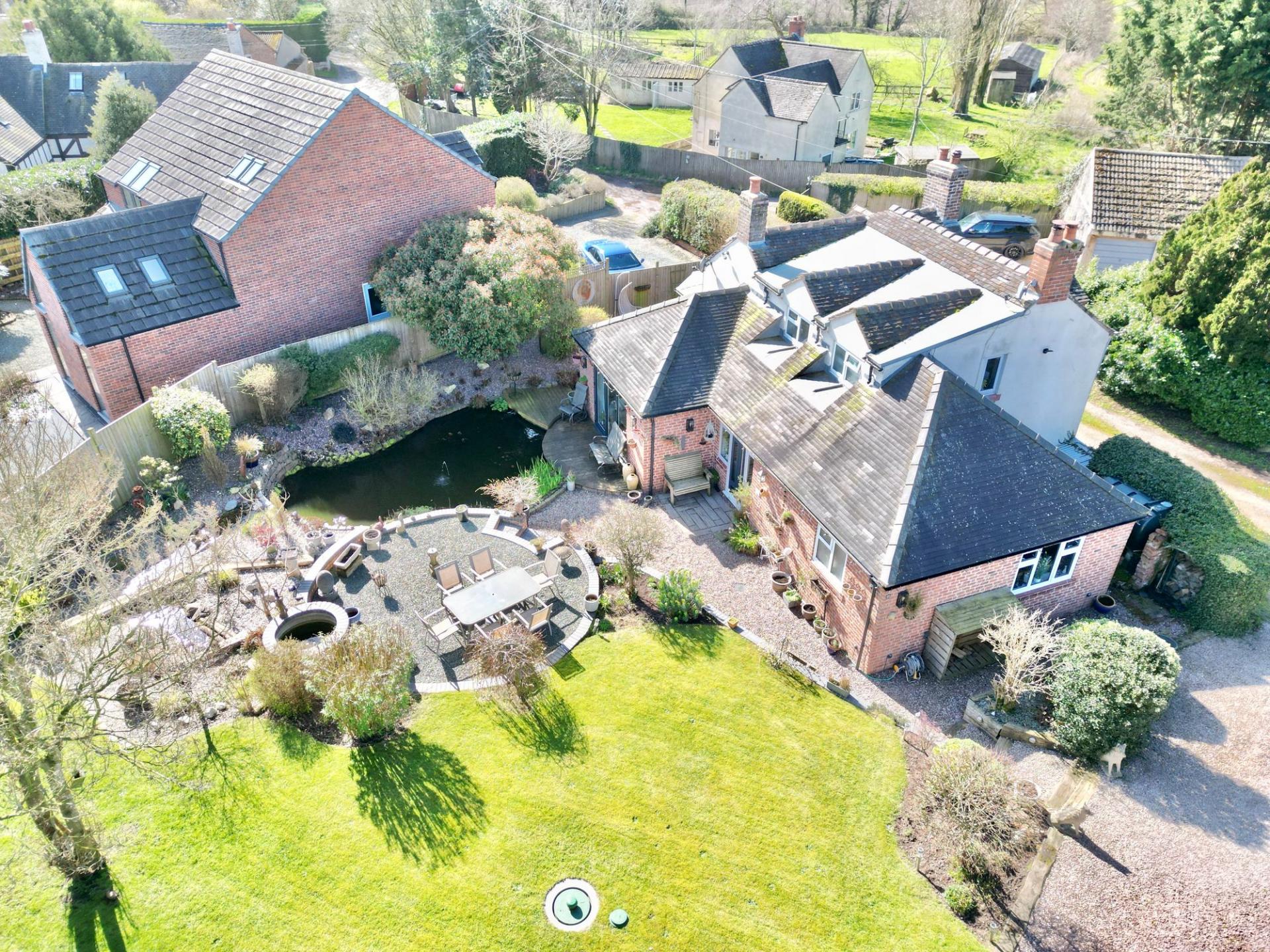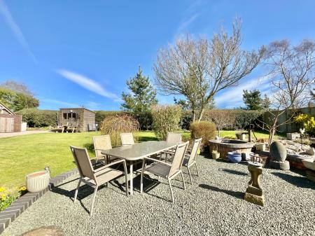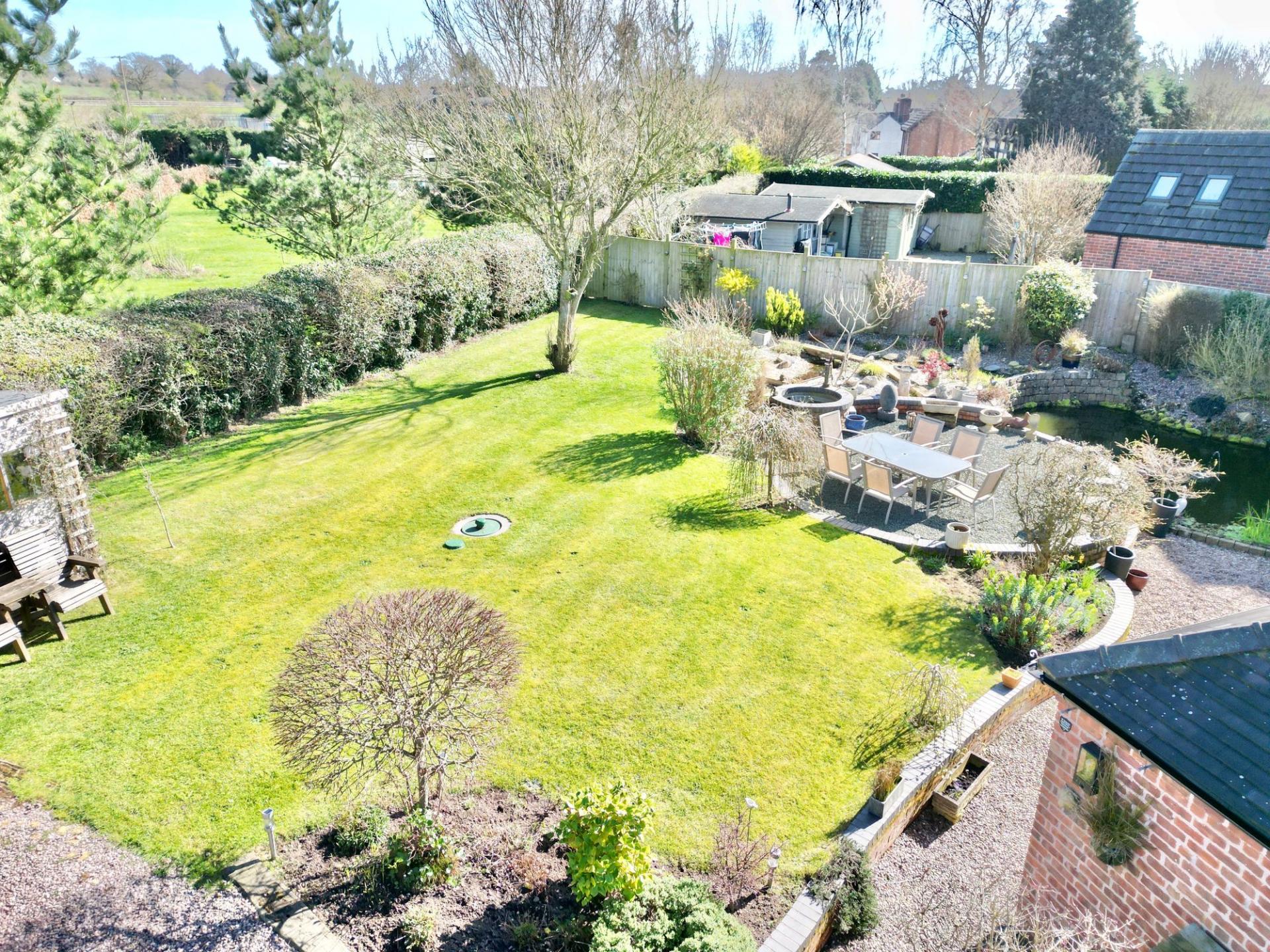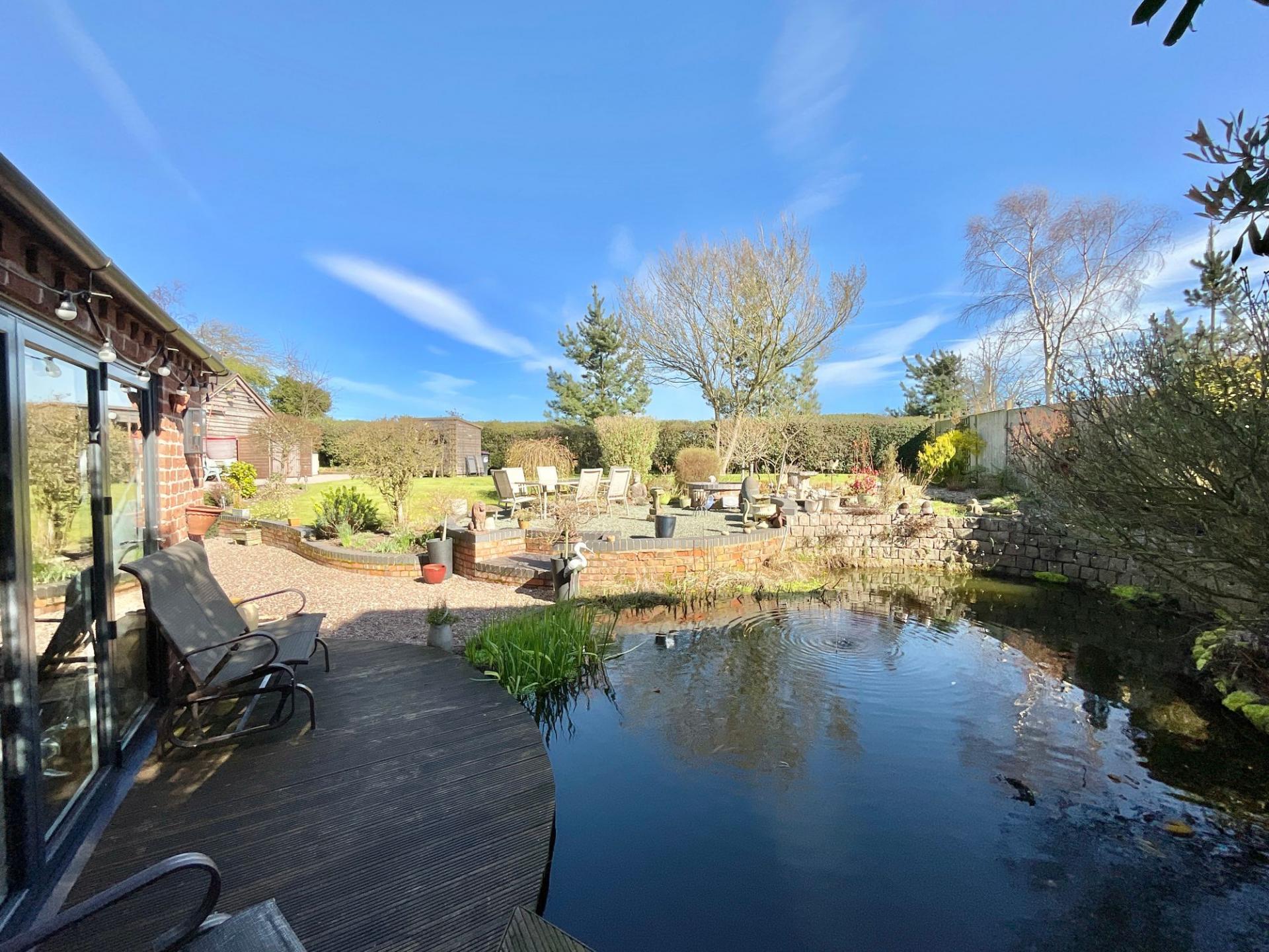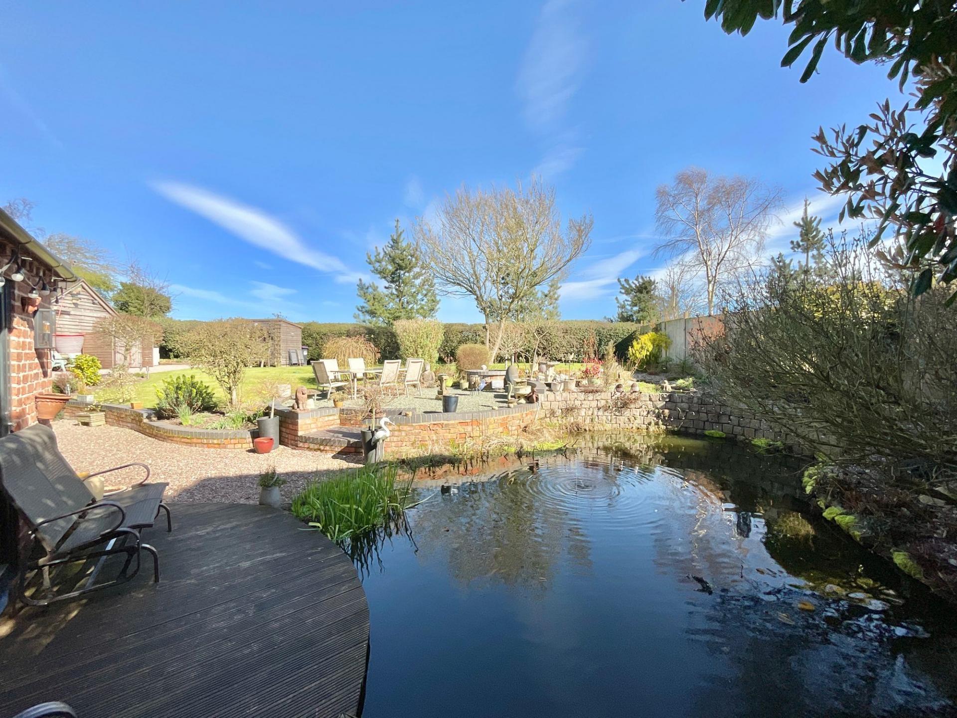 - A spacious garden unfolds with abundant open space, featuring a private pond, inviting outdoor seating areas, a practical bike shed, and a beautifully crafted oak frame garage for vehicles