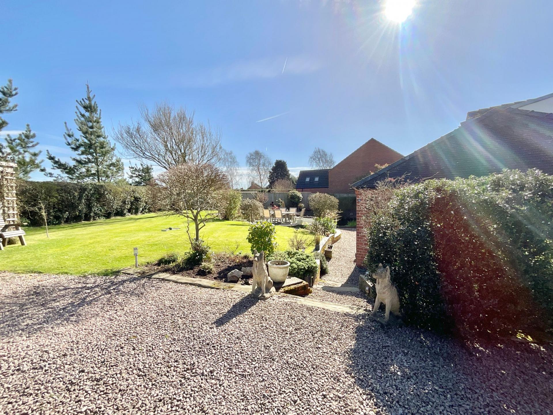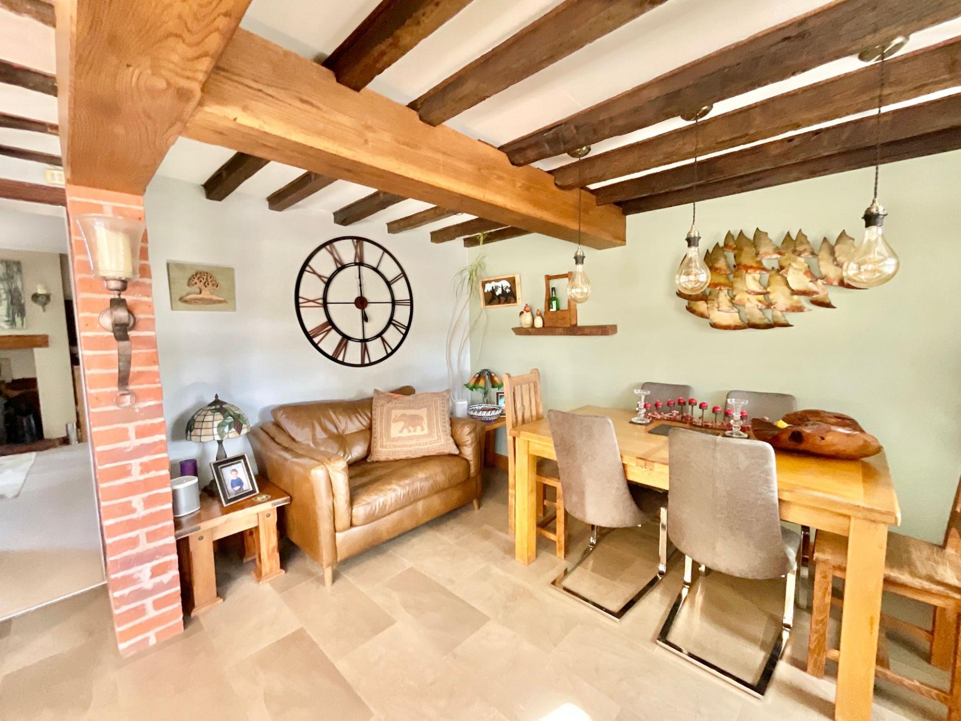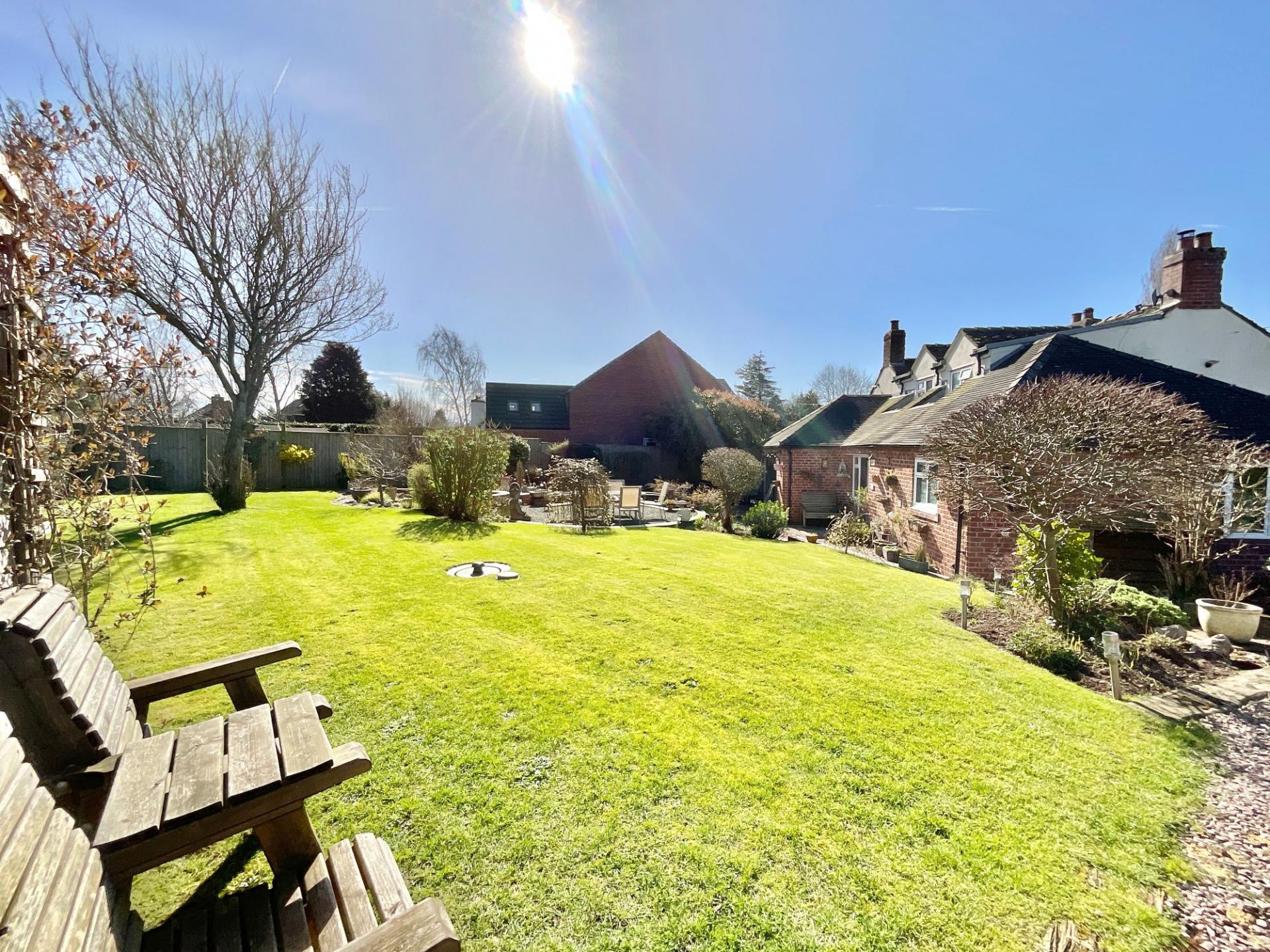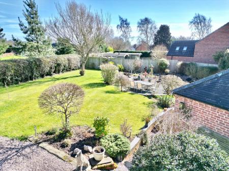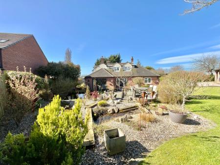 - A spacious garden unfolds with abundant open space, featuring a private pond, inviting outdoor seating areas, a practical bike shed, and a beautifully crafted oak frame garage for vehicles