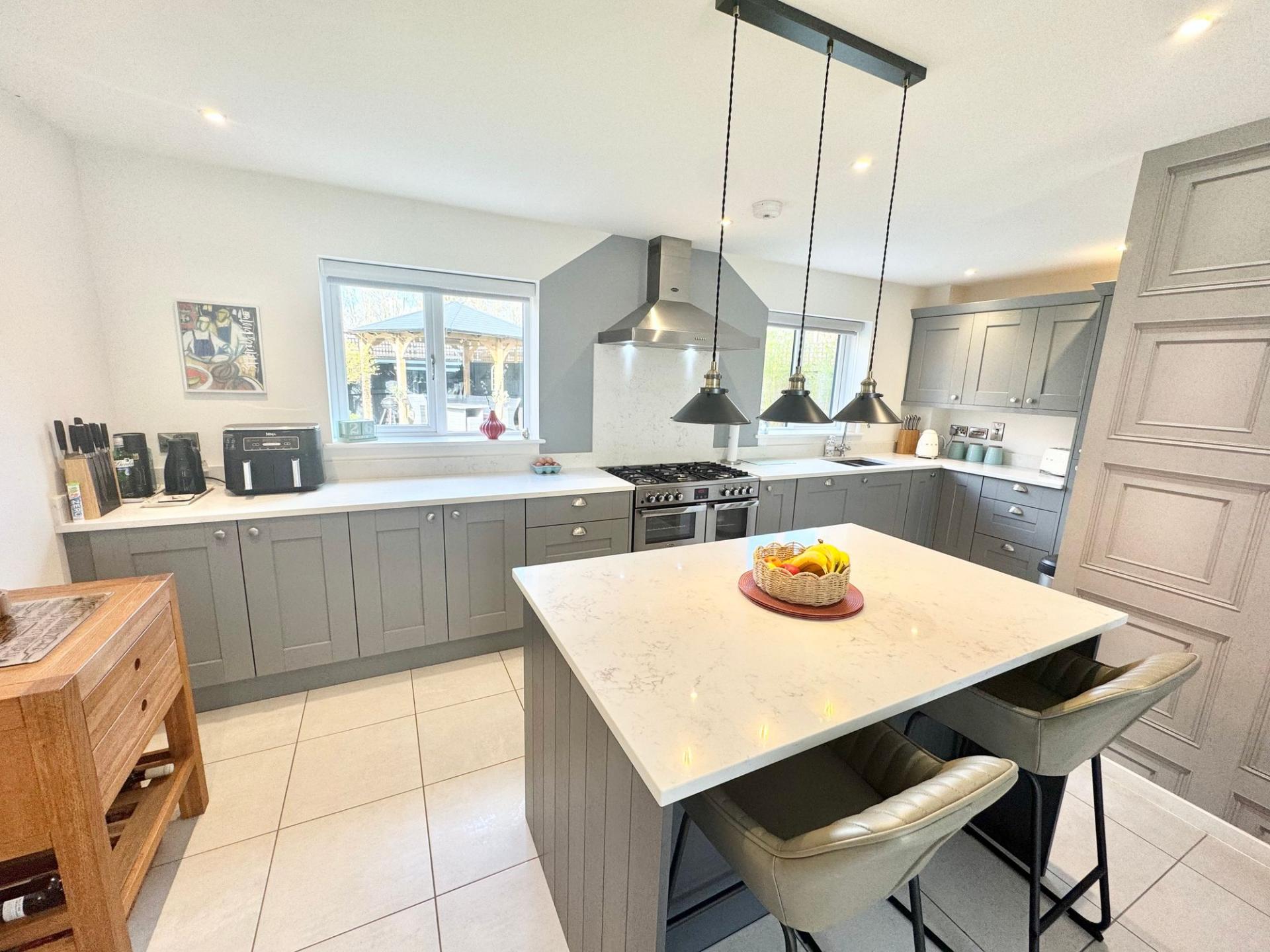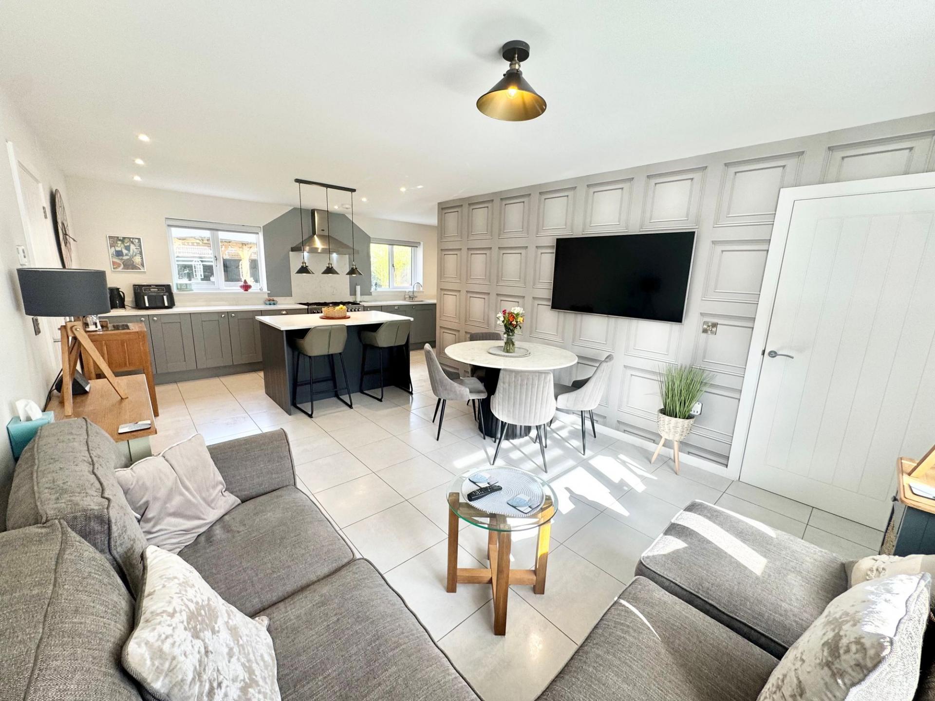 - Stunning open-plan kitchen, dining and sitting area forming the heart of the home, complete with a central island, high-specification units, integrated appliances, and ample space for the family.