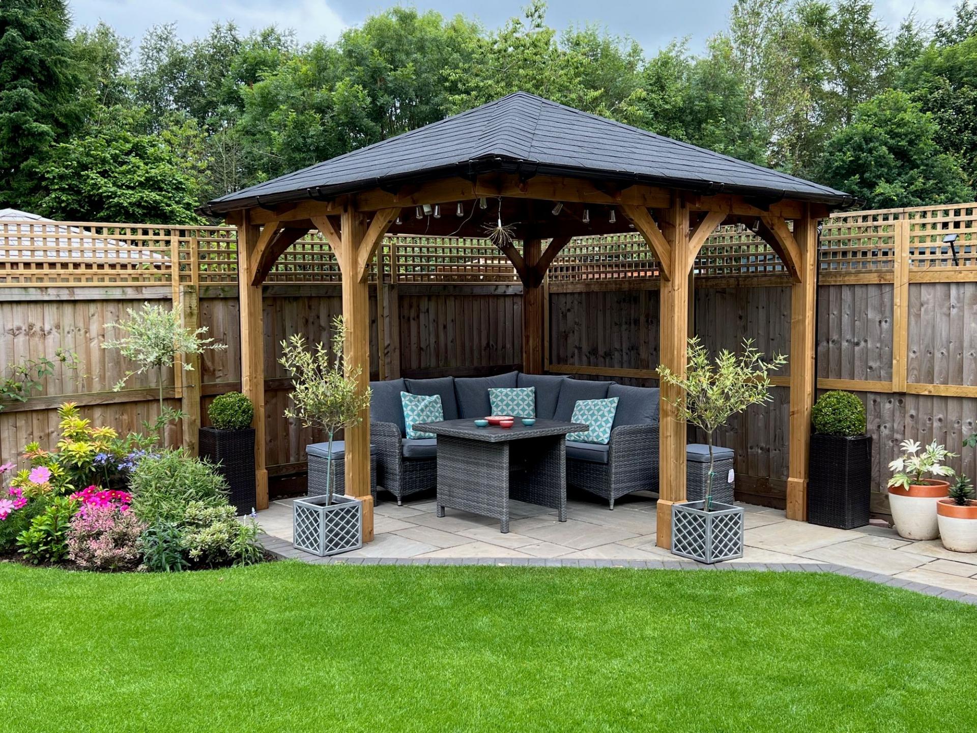 - Beautifully landscaped rear garden featuring an Indian stone patio and a fully enclosed gazebo seating area, complemented by a detached double garage.