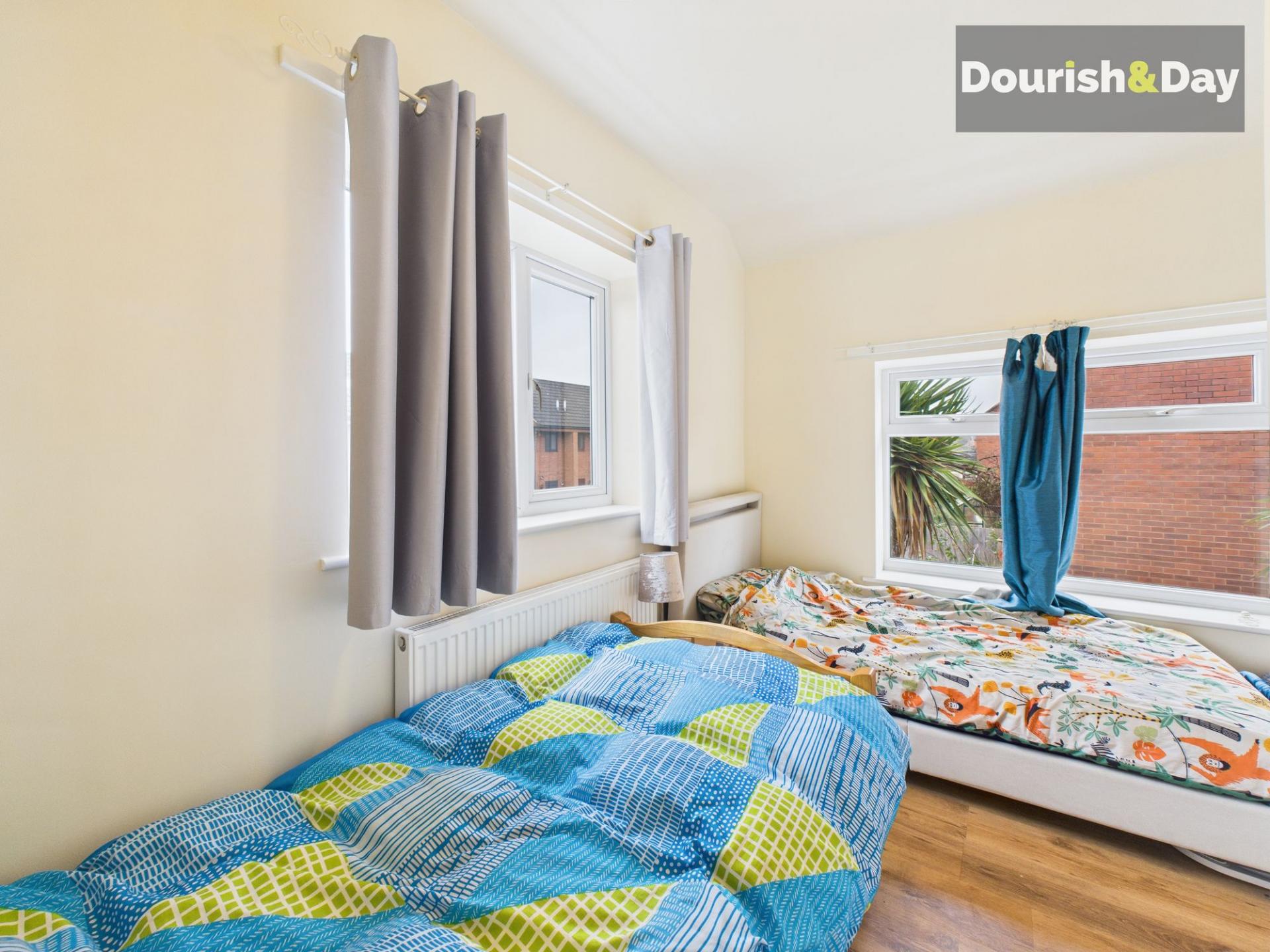 Upstairs offers two spacious, light-filled bedrooms and a family bathroom with bath and shower over. Outside, the home benefits from a neatly landscaped front approach with paved pathway, shale borders, full-length planting beds and a standout palm tree that brings a unique splash of colour and personality.