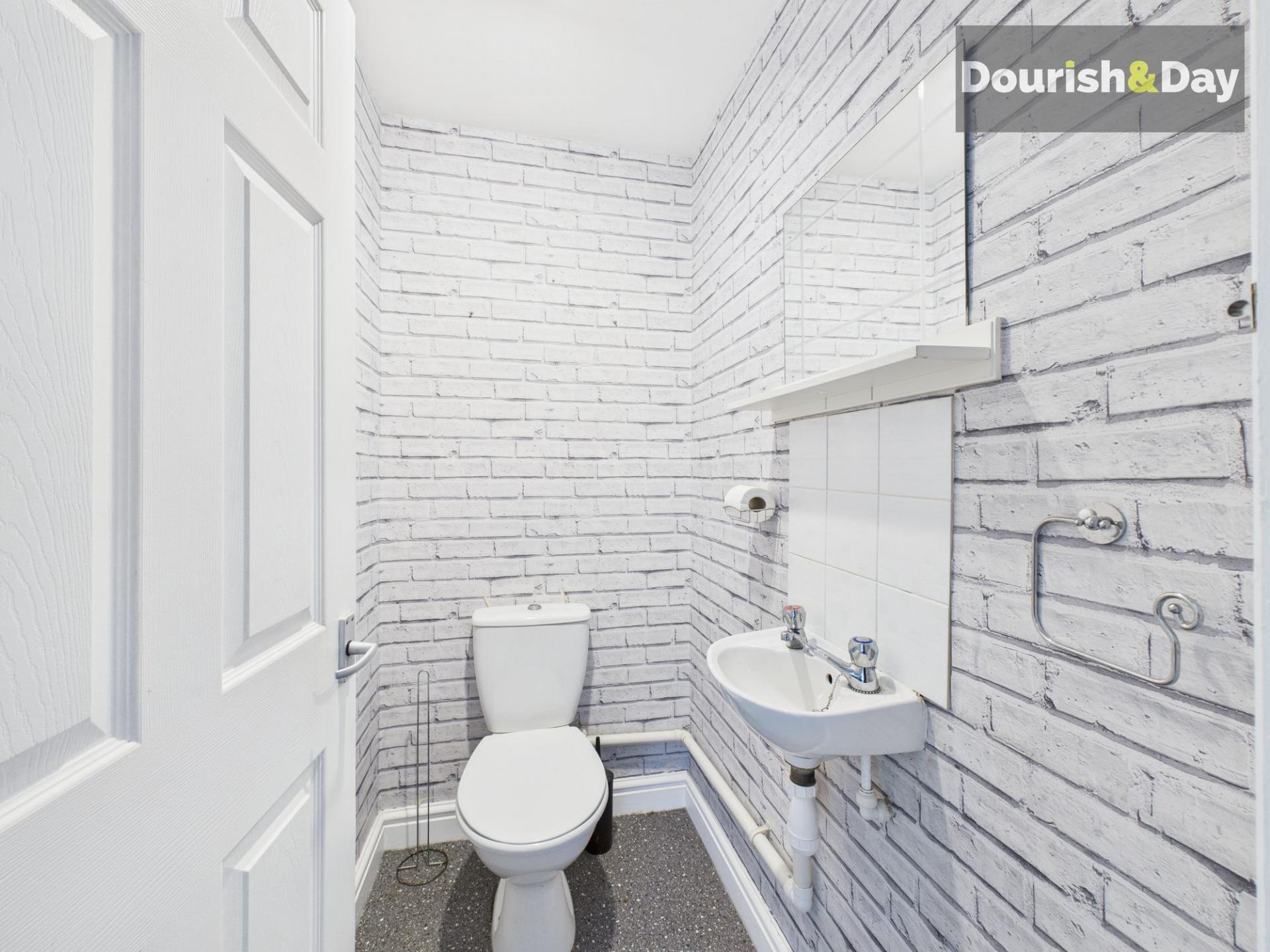 The property opens into a welcoming hallway with useful storage for everyday essentials, leading through to a bright and well-appointed fitted kitchen offering plenty of cupboard space and work surfaces. A ground-floor WC sits conveniently off the hall, while the generous living room provides an inviting space to unwind, complete with French doors opening onto the patio area at the rear.