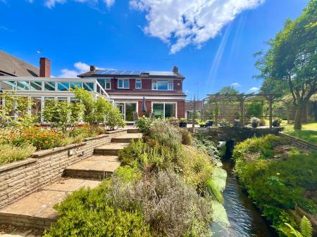 - The huge driveway will house all your family vehicles and guests, along with a double garage with access in to the picturesque rear garden with a stream running right through it.