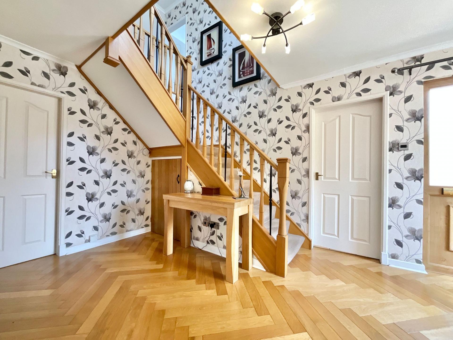 - An impressive entrance hallway with a winding staircase, galleried landing, guest W.C on the left, kitchen/breakfast room to the right, as well a utility room, laundry room and large study.