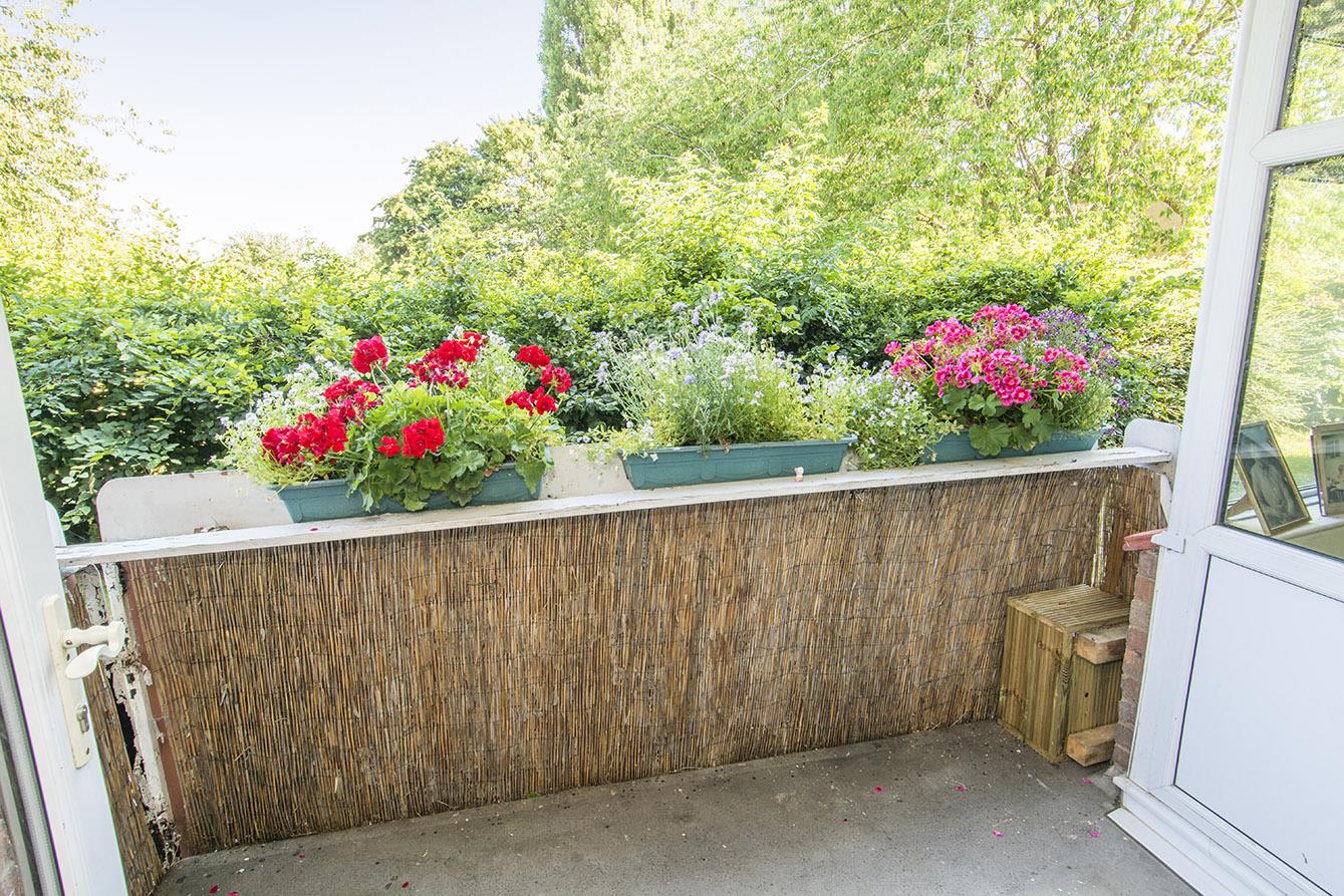Outside - Apart from the private balcony, there are small maintained, communal gardens and non allocated parking. There is also a useful lockable store.