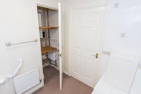 Bathroom - 2.21m x 1.96m (7'3 x 6'5) - White three piece suite comprising WC, wash hand basin and panelled bath with electric shower over, emergency pull-chord, shaver point, radiator, airing cupboard off housing modern Worcester combination central heating boiler and radiator.